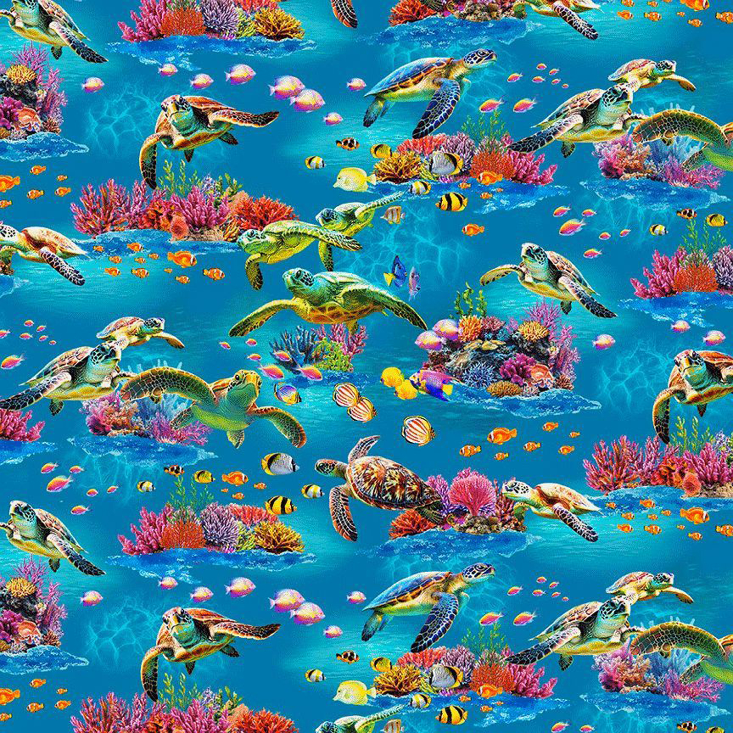 A Cotton Print Fabric of Sea Turtles from Timeless Treasures Fabrics from their Underwater Paradise collection.