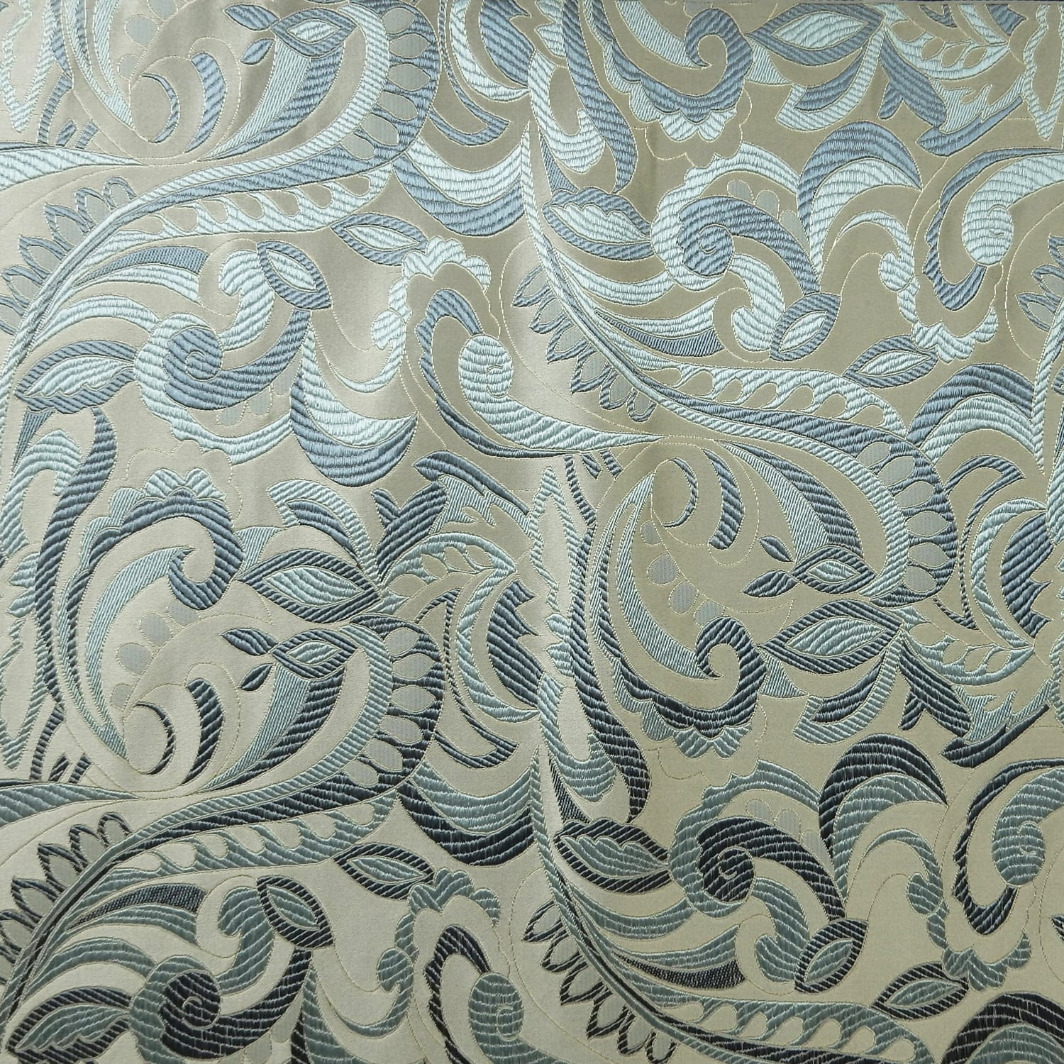 An exquisitely woven, Paisley Satin Brocade Fabric in a natural blend of silk and rayon, finished with an elegant soft shine. Colors include shades of dusty blue on a silver background.