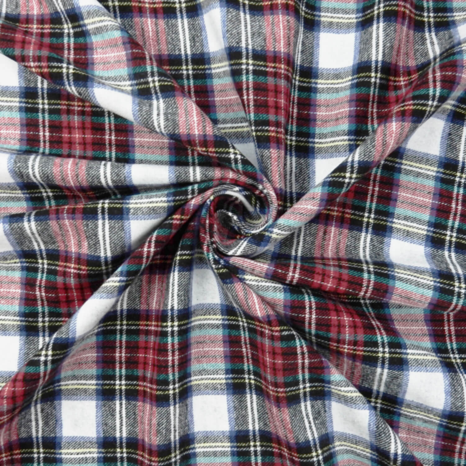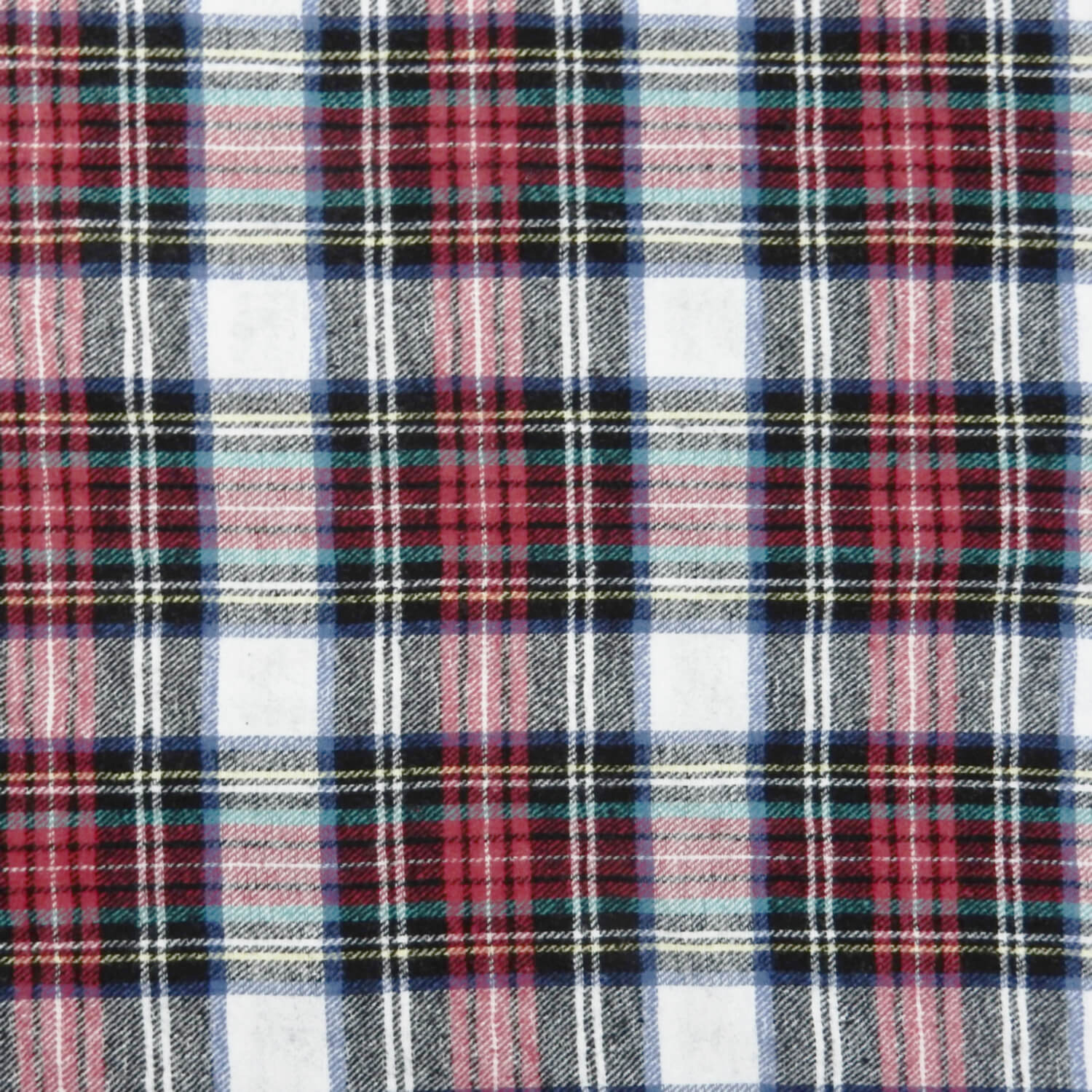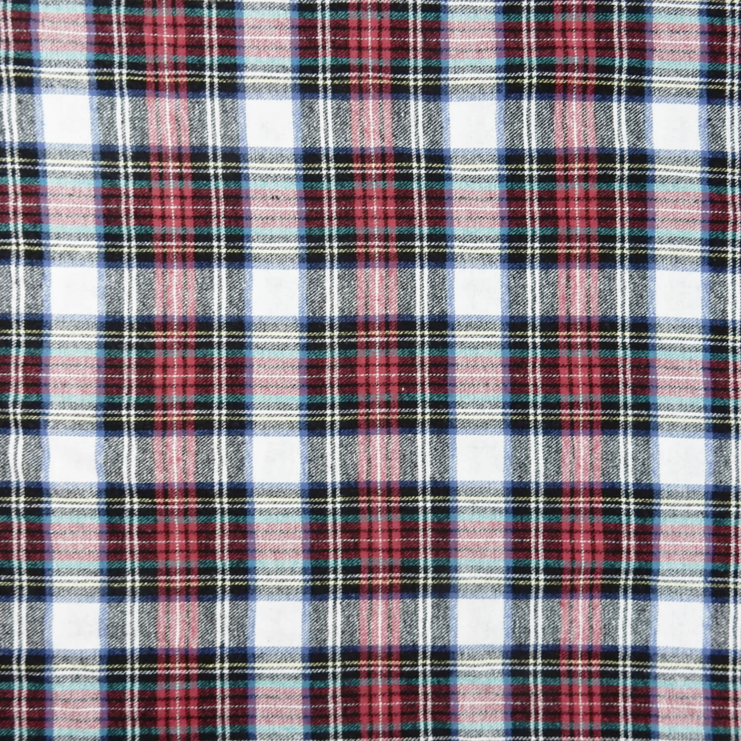 A classic soft as butter 100% Cotton Yarn Dyed Flannel Plaid Fabric in red, black and white, with accents of yellow, royal blue and aquamarine stripes.