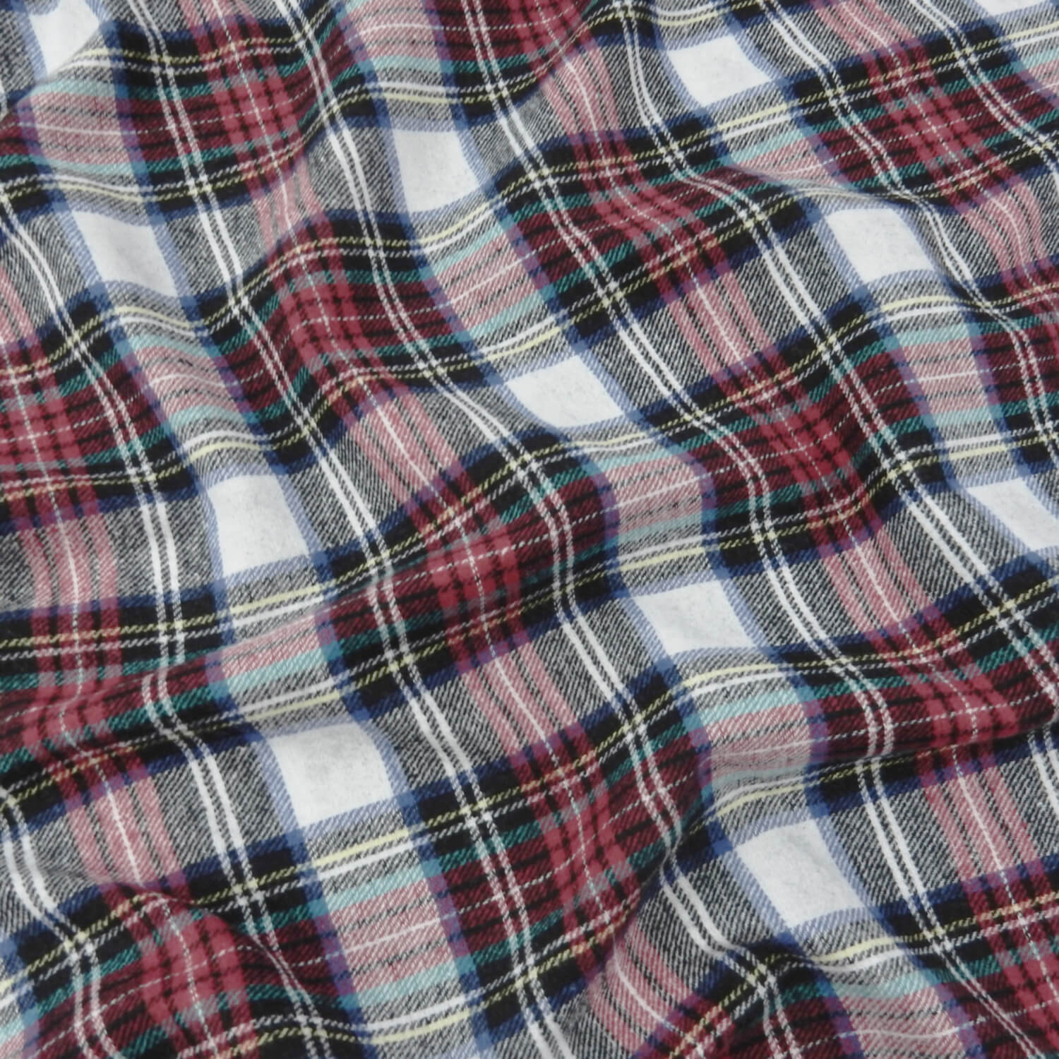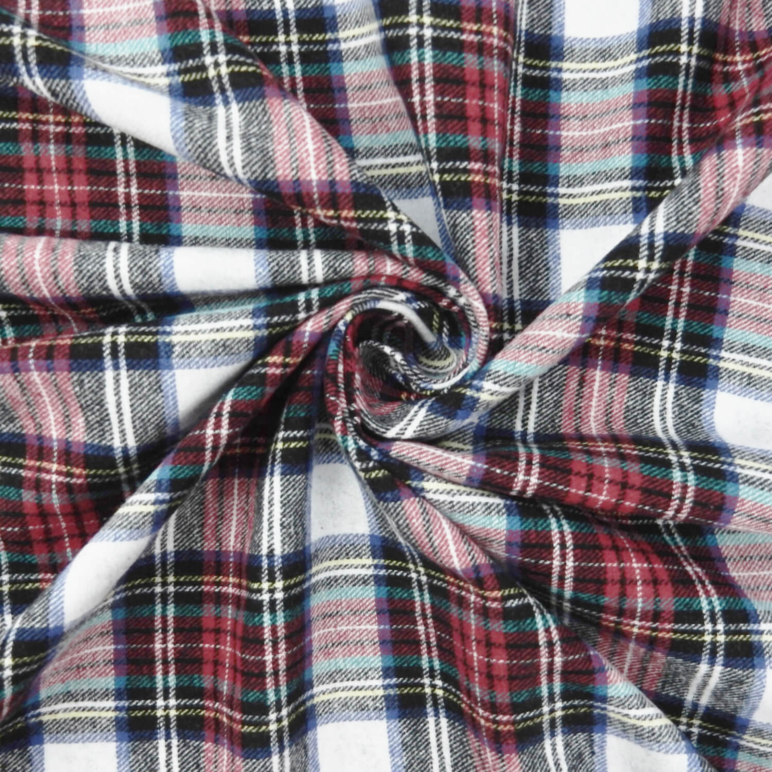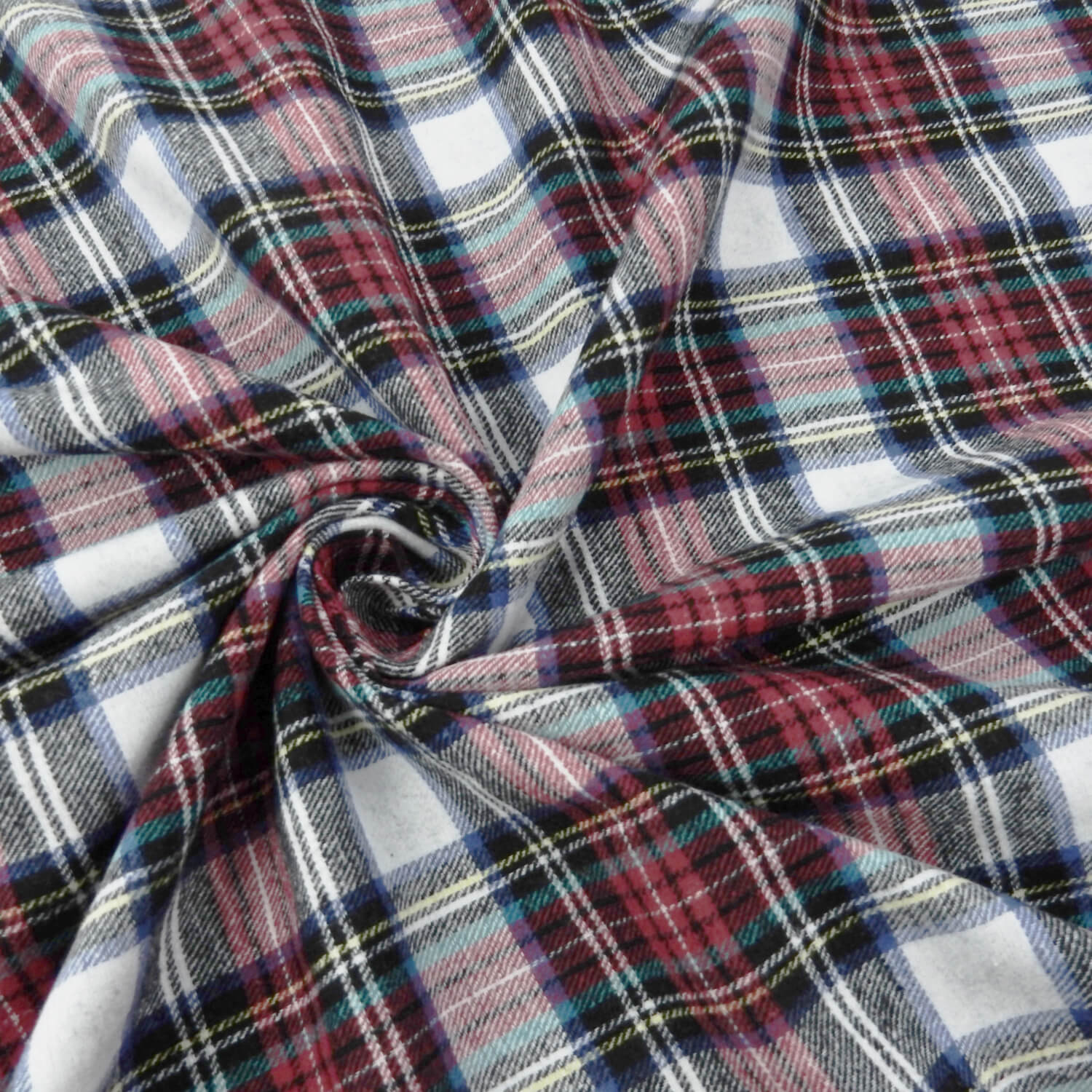 A classic soft as butter 100% Cotton Yarn Dyed Flannel Plaid Fabric in red, black and white, with accents of yellow, royal blue and aquamarine stripes.