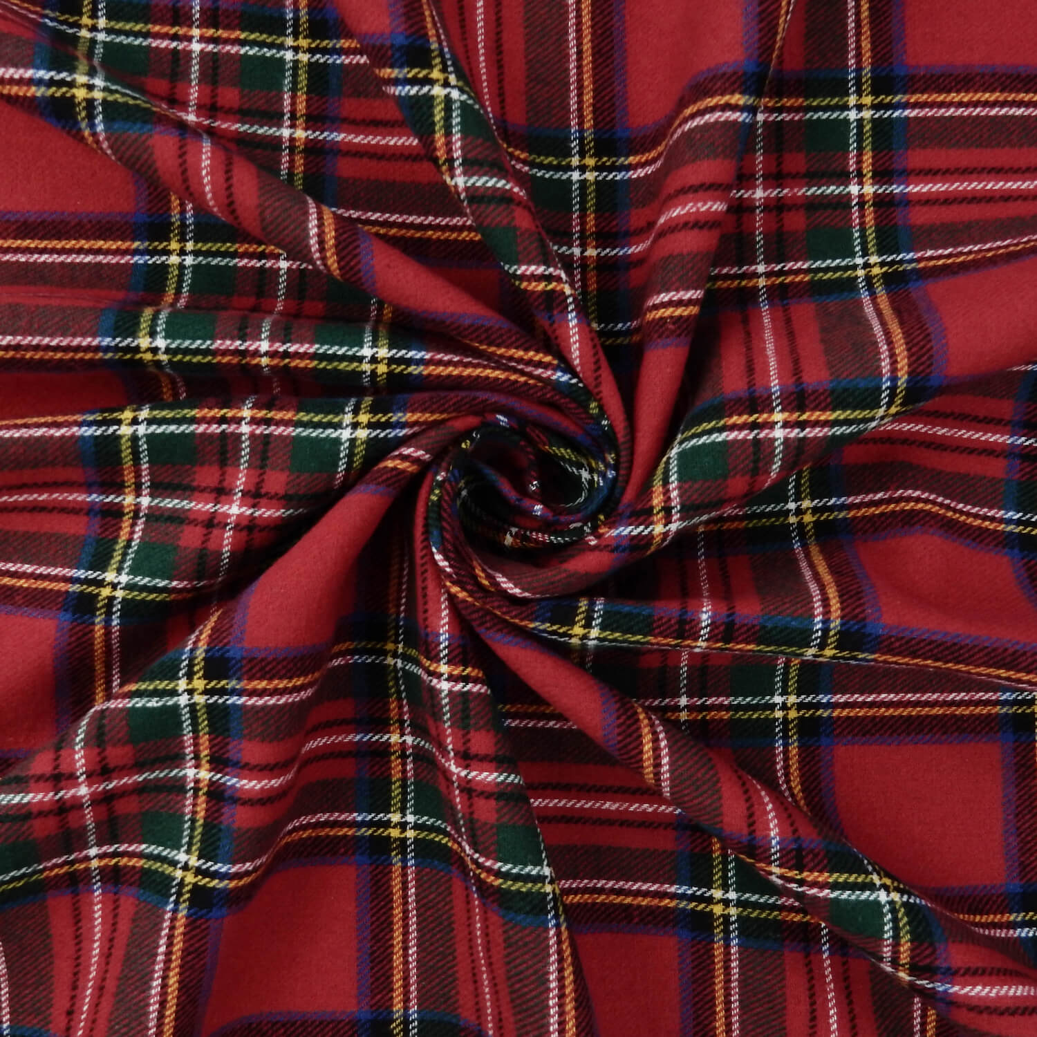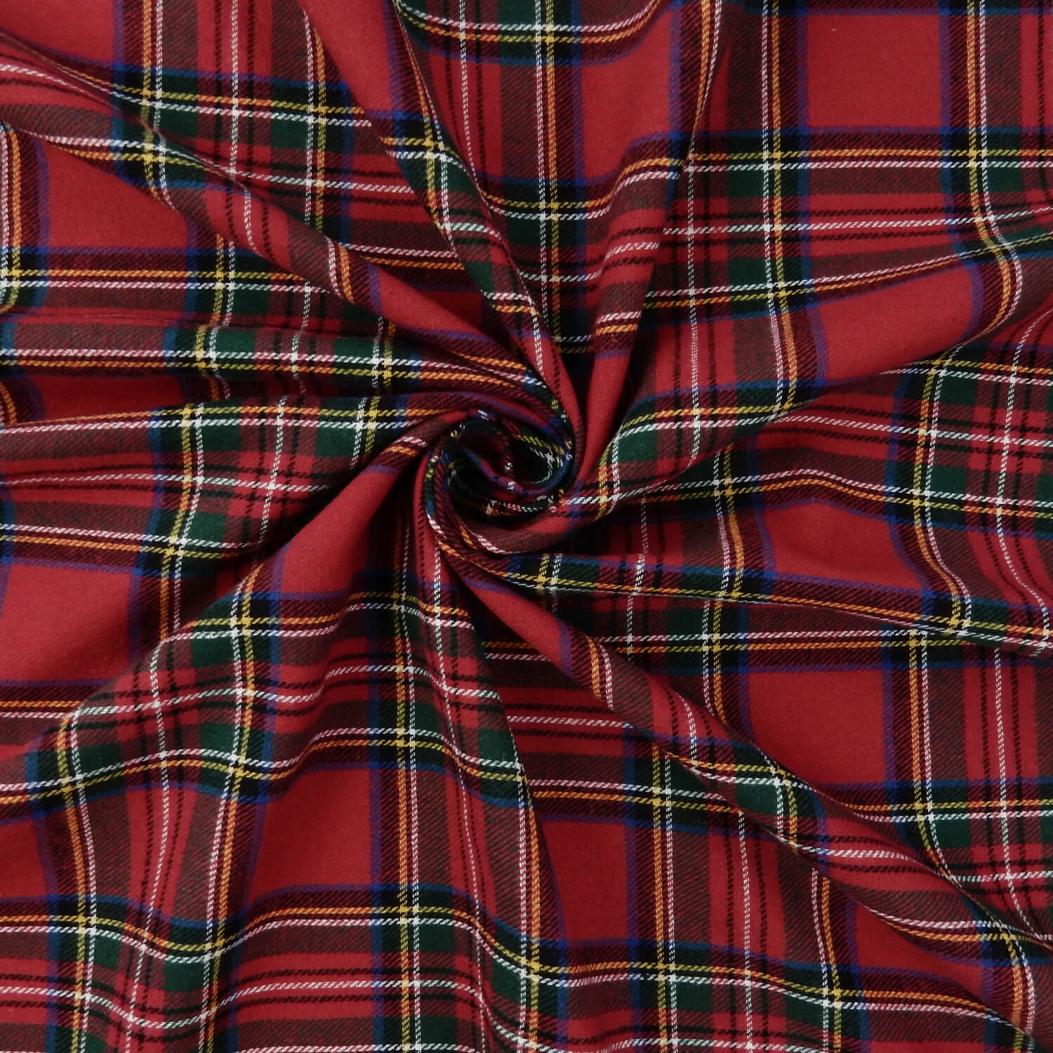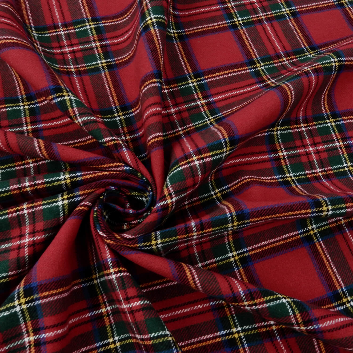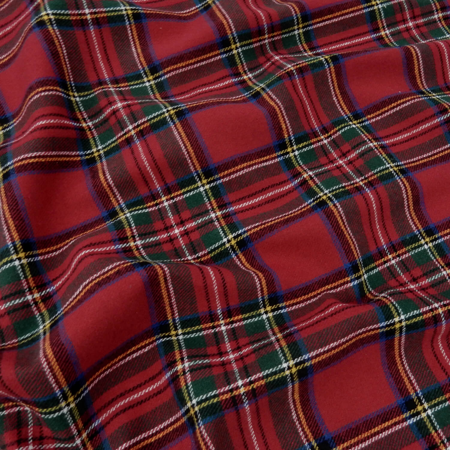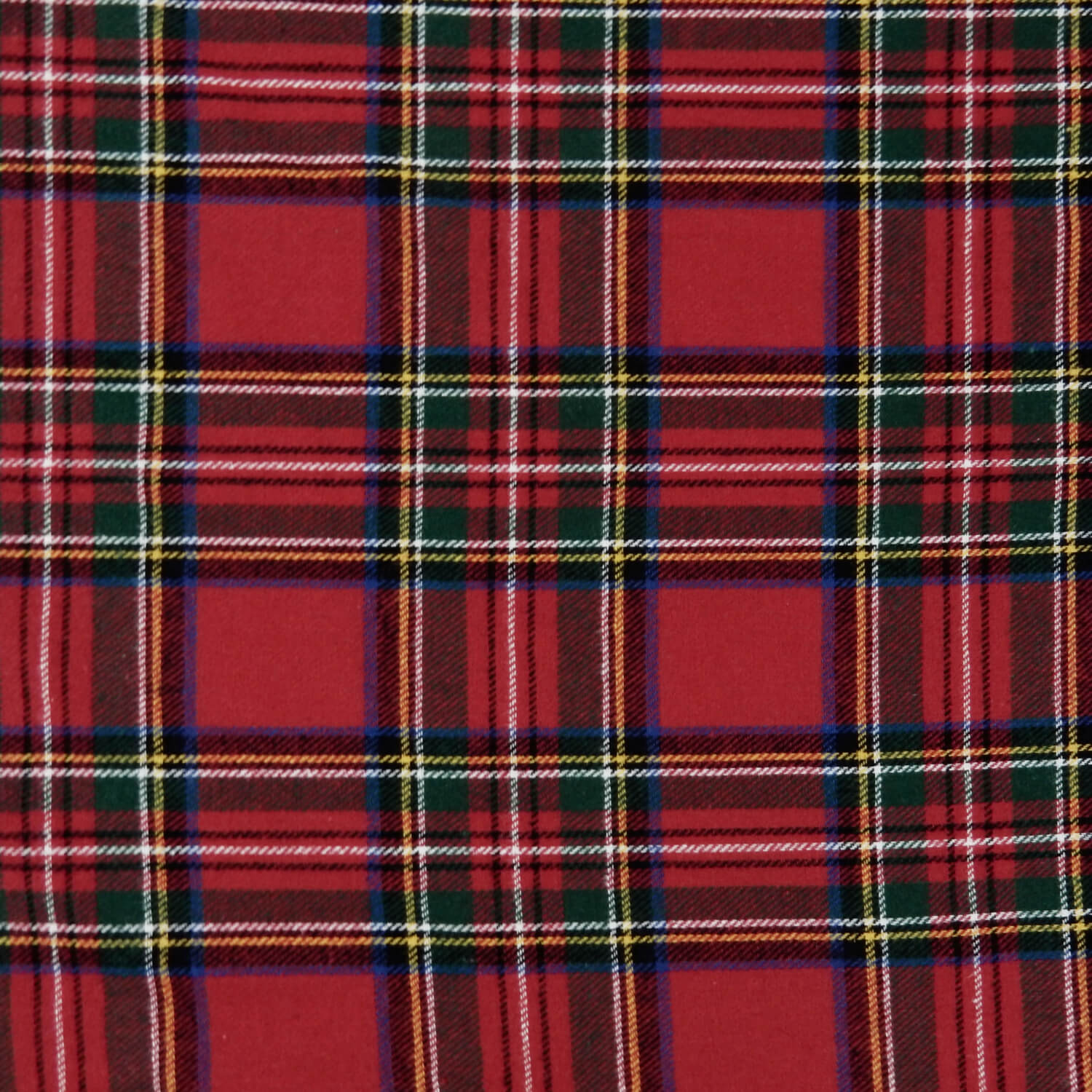 A classic Royal Stewart Red, soft as butter 100% Cotton Yarn Dyed Flannel Plaid Fabric in the traditional red, green, blue colors with accents of white and yellow.