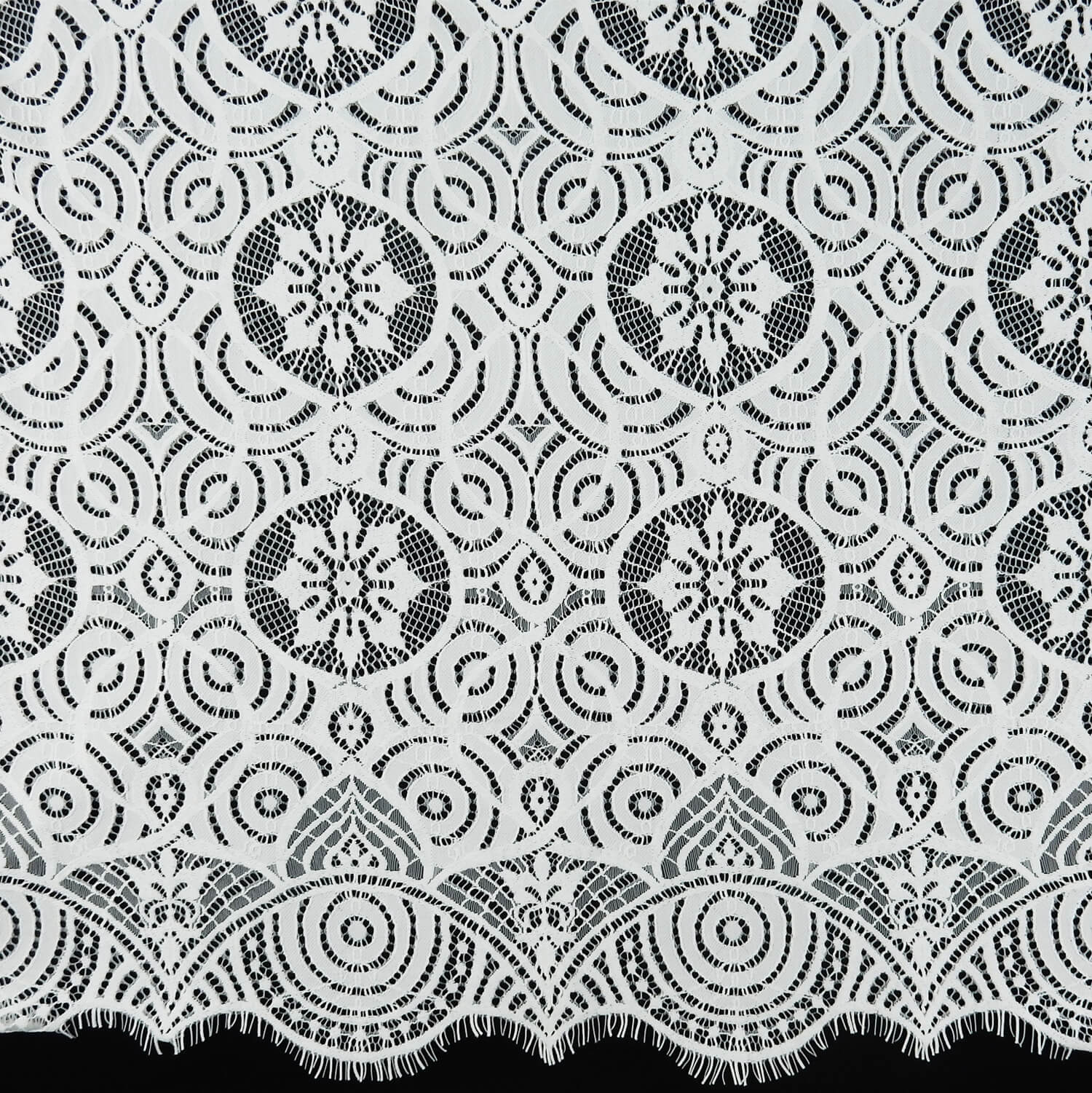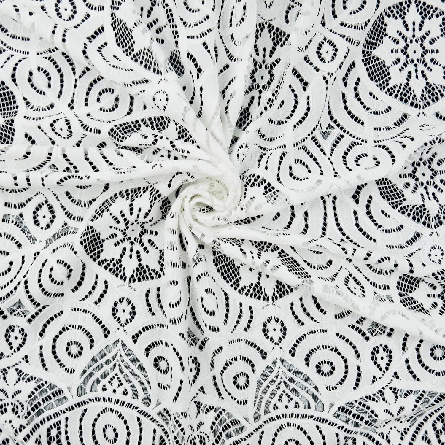 A diamond white color, Luxe Stretch Embroidered Lace Fabric in a geourgous swirling geometric design surrounded by an open mesh finished with a double sided scalloped border. 4-way stretch is approximately 16% for added comfort.