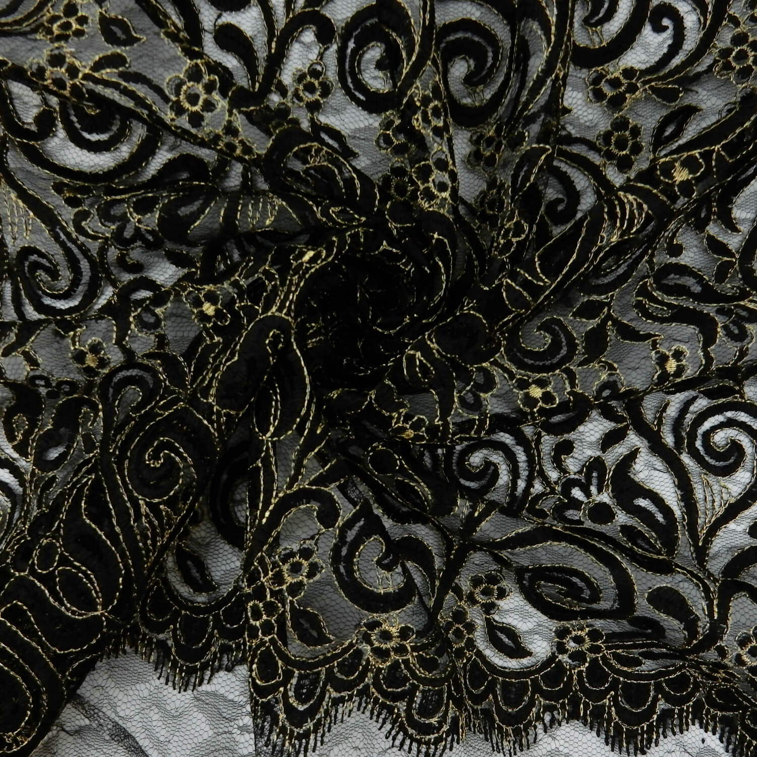 An exquisite heavily embroidered, Luxe Venice Galloon Lace Fabric in black and metallic gold on a sheer jacquard mesh fabric, finished with a double-sided scalloped border.