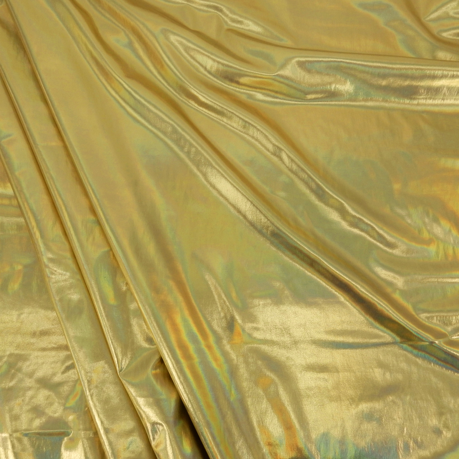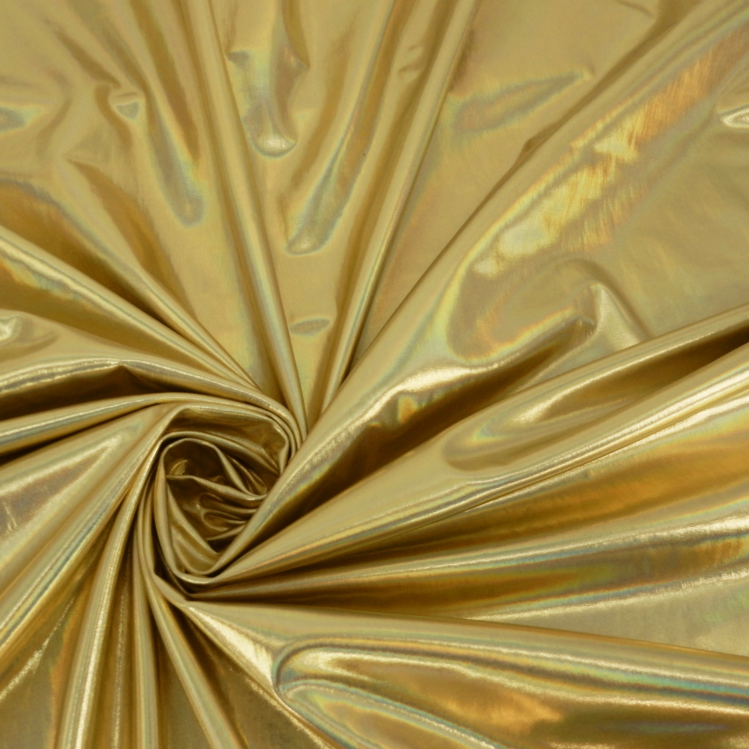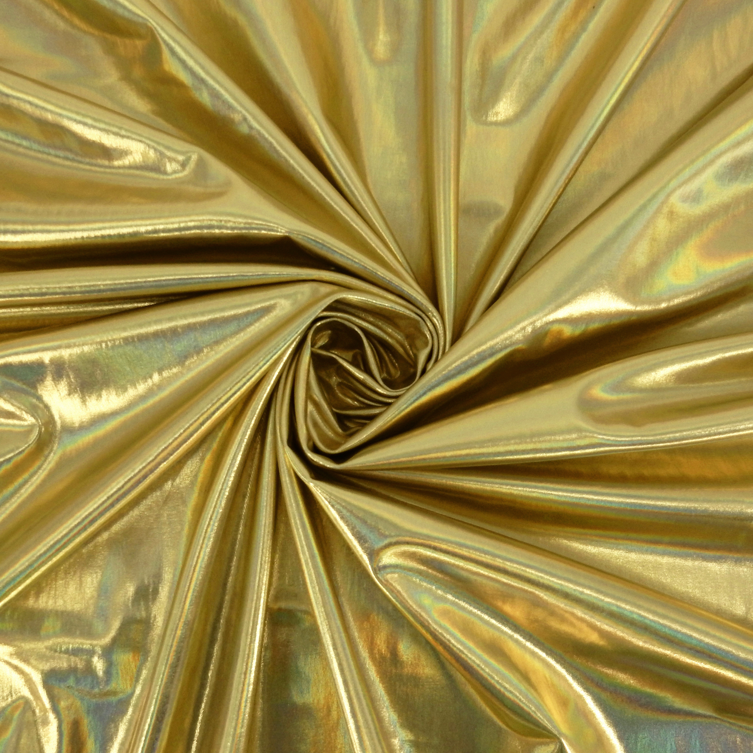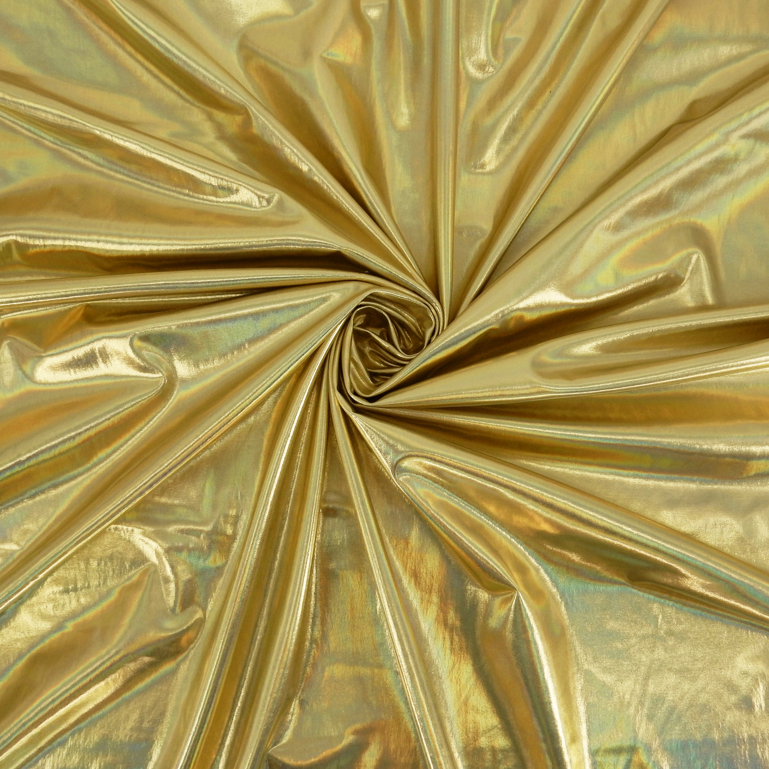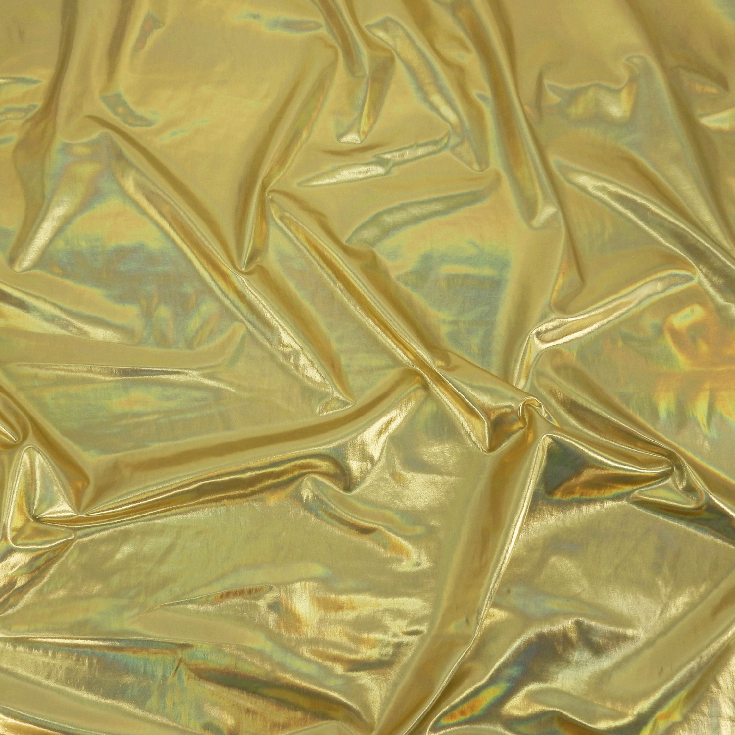 A 4-way stretch, Gold Nylon Spandex Fabric with a Hologram Metallic Foil face, finished with a soft comfortable drape.