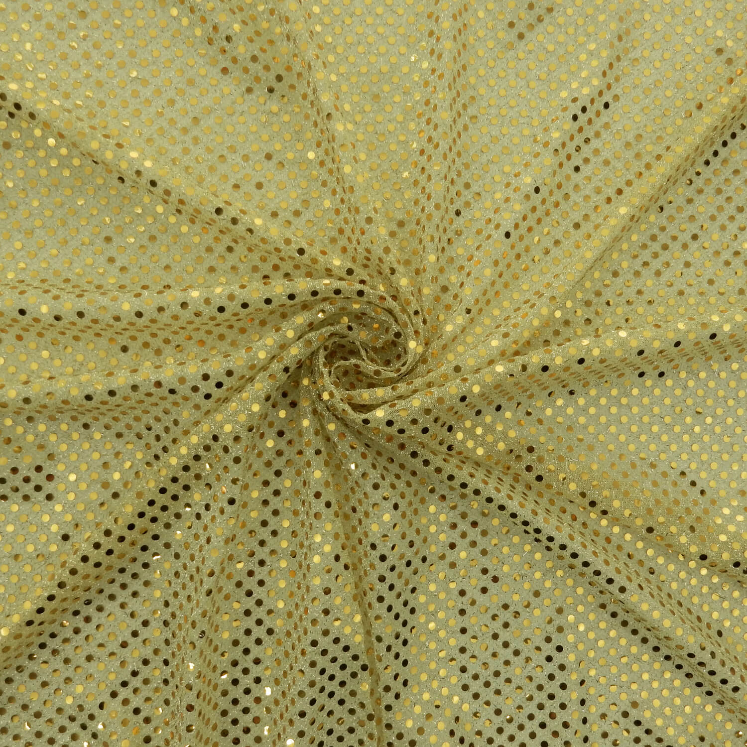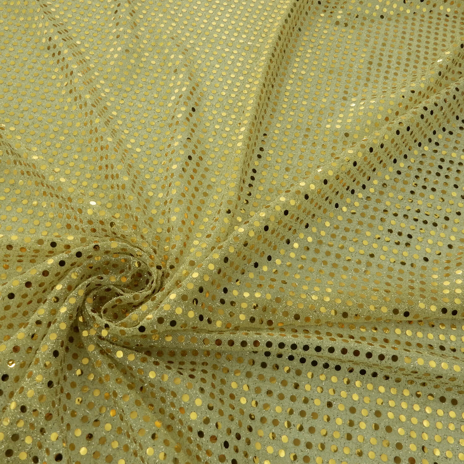 Gold 3mm Sequin Style Dot on a light weight Gold Tricot Knit.