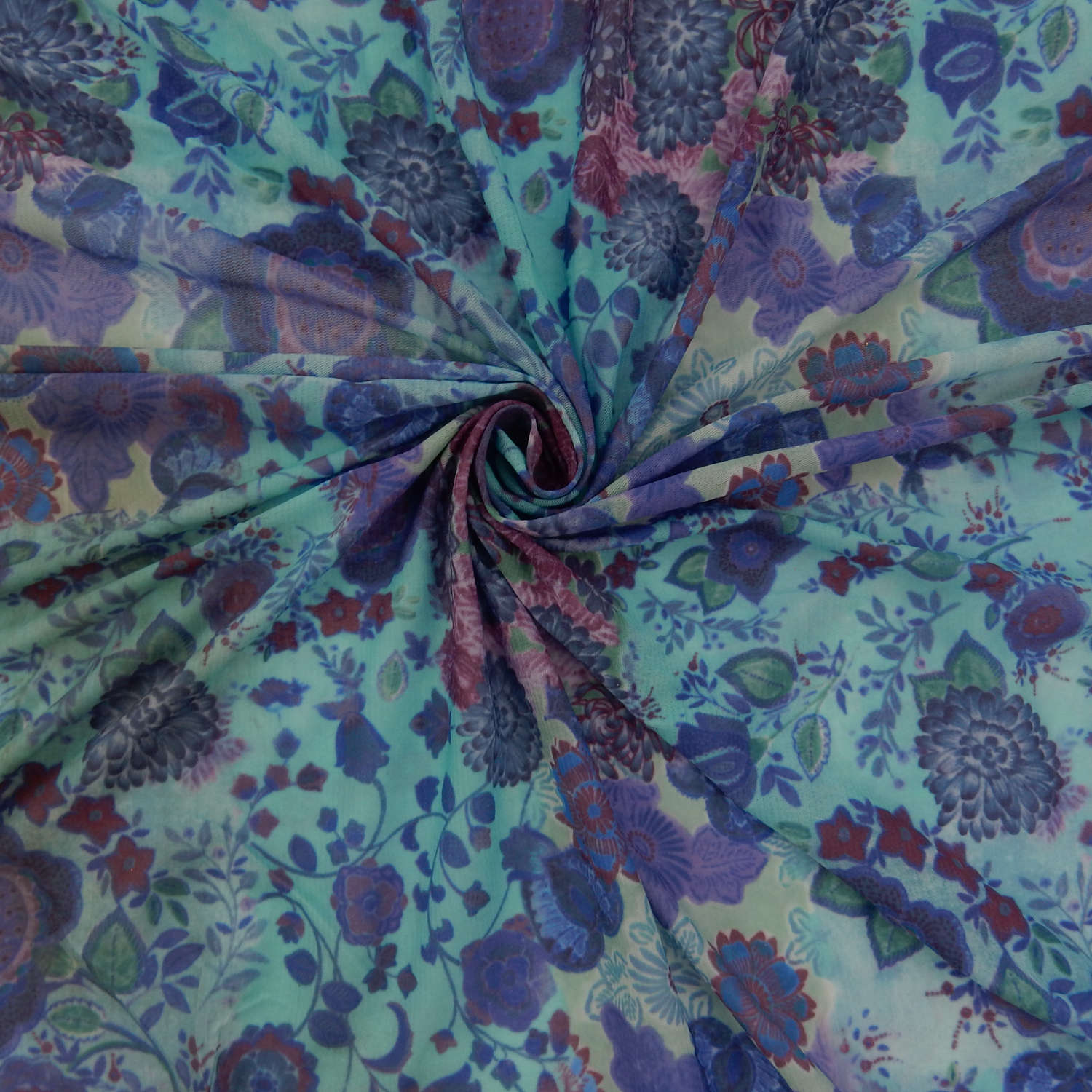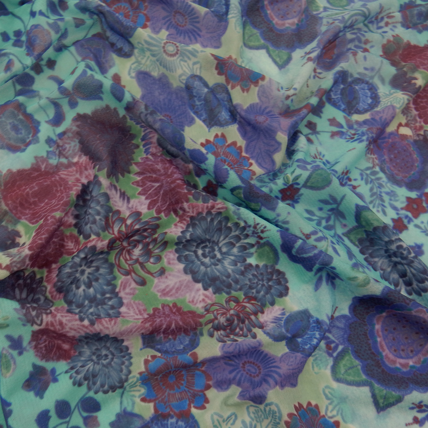 Gorgeous flowers on a very light weight, semi-sheer, soft and flowing 4-way stretch fabric in shades of blue, lilac, purple and wine.