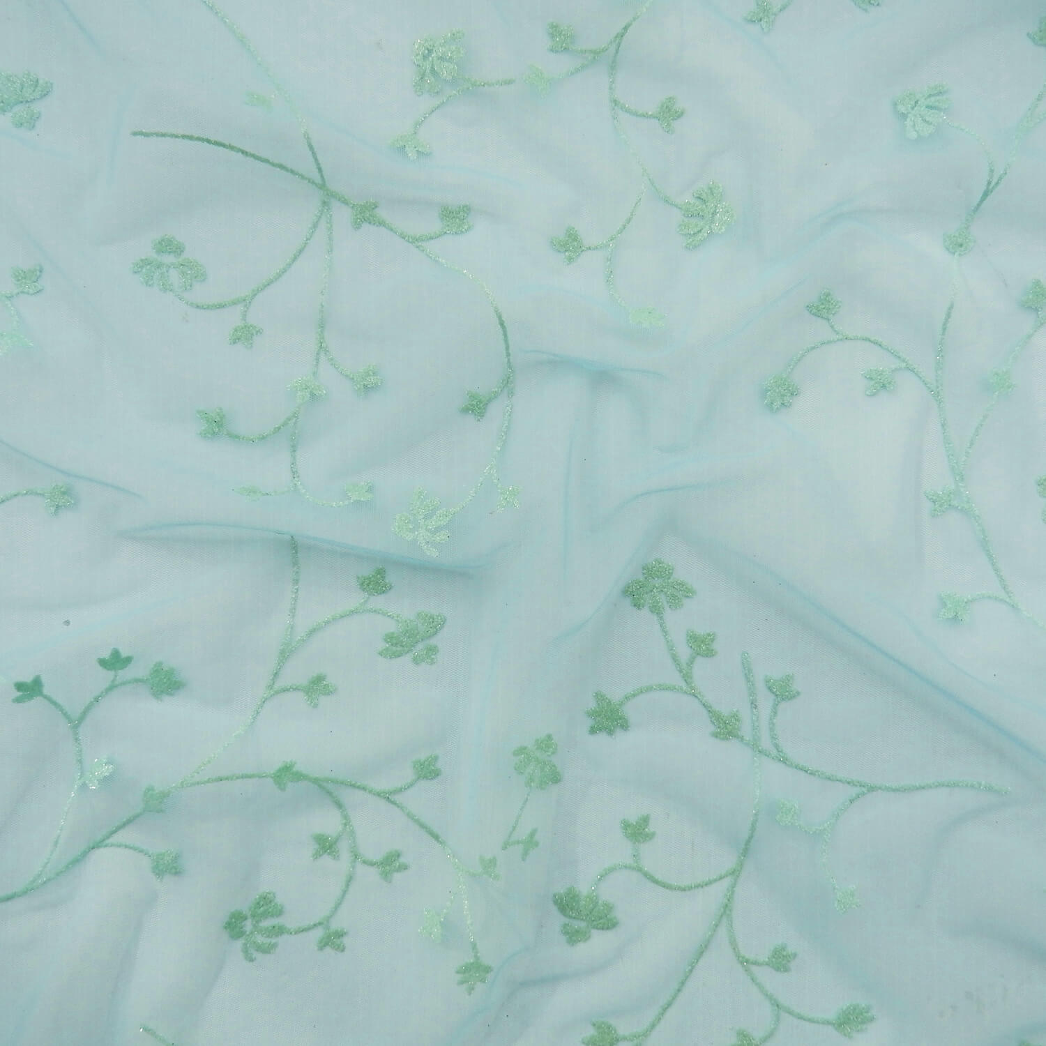 Aquamarine velvet flocking in a floral vine design with hologram sparkle accents on a 2-way stretch sheer, sky blue color mesh Fabric, Approximately 16% 2-way stretch from selvage to selvage.