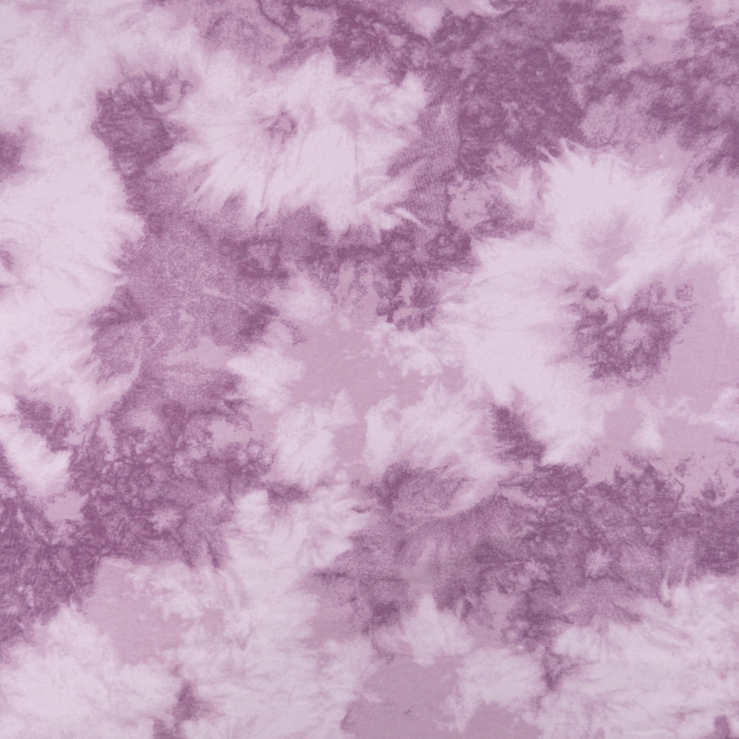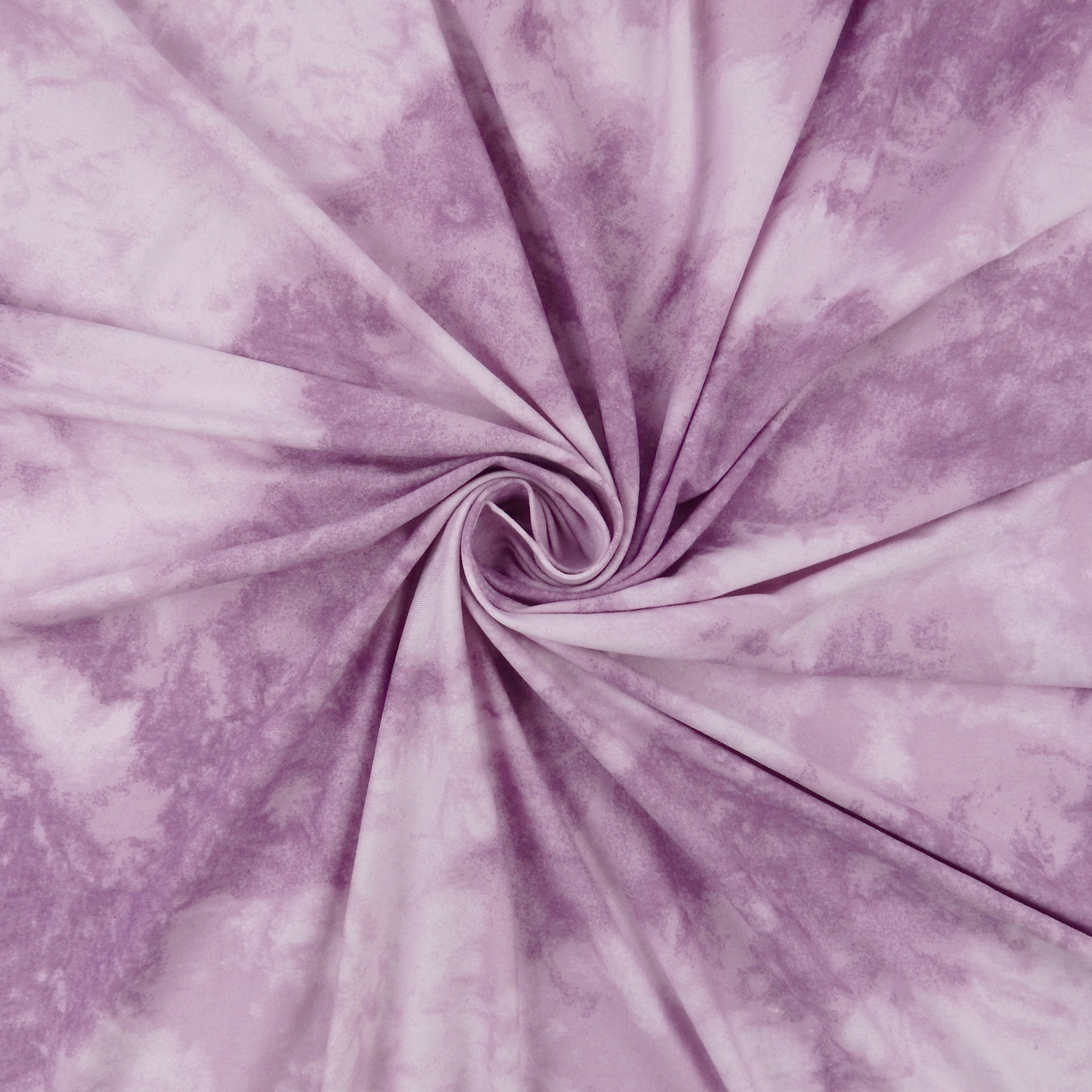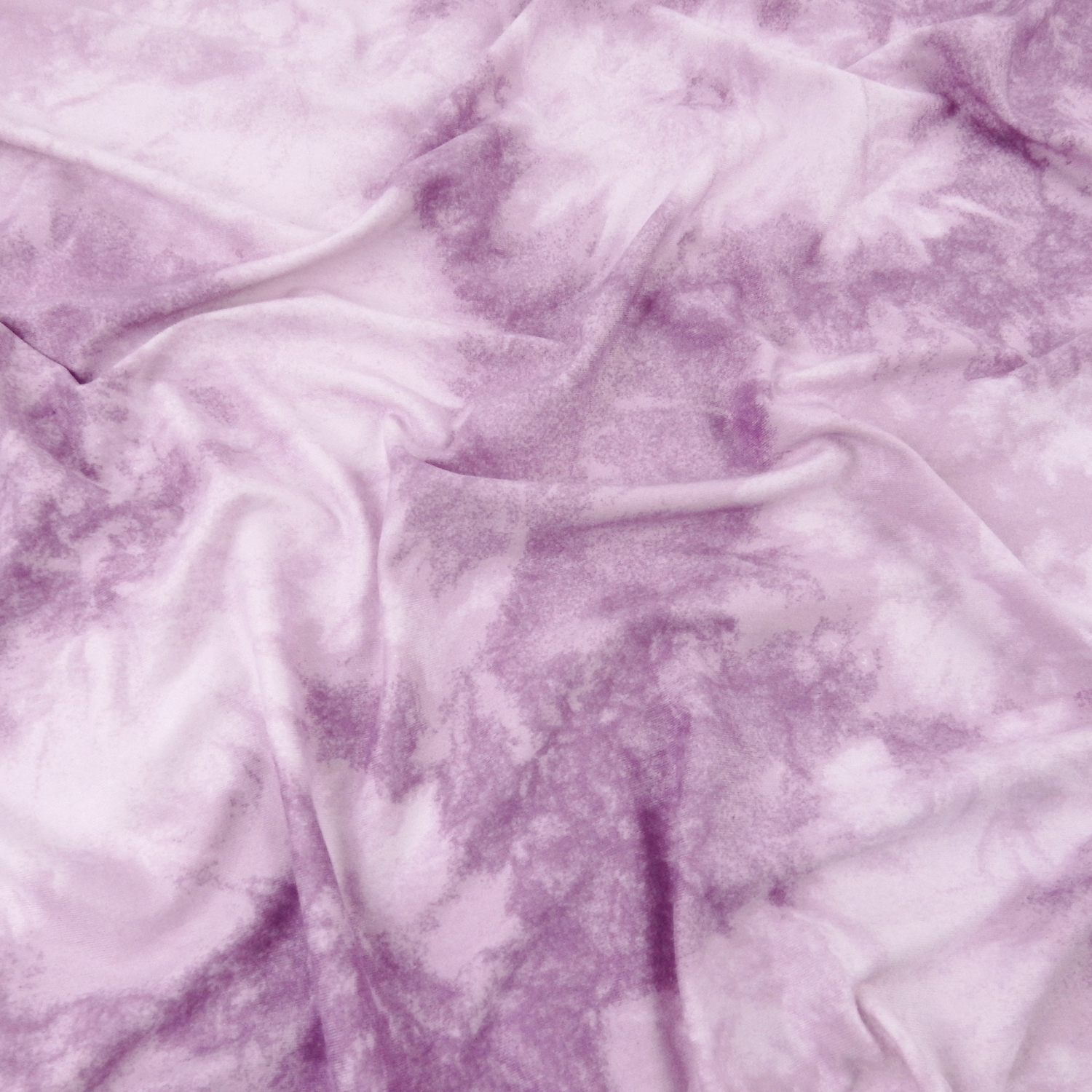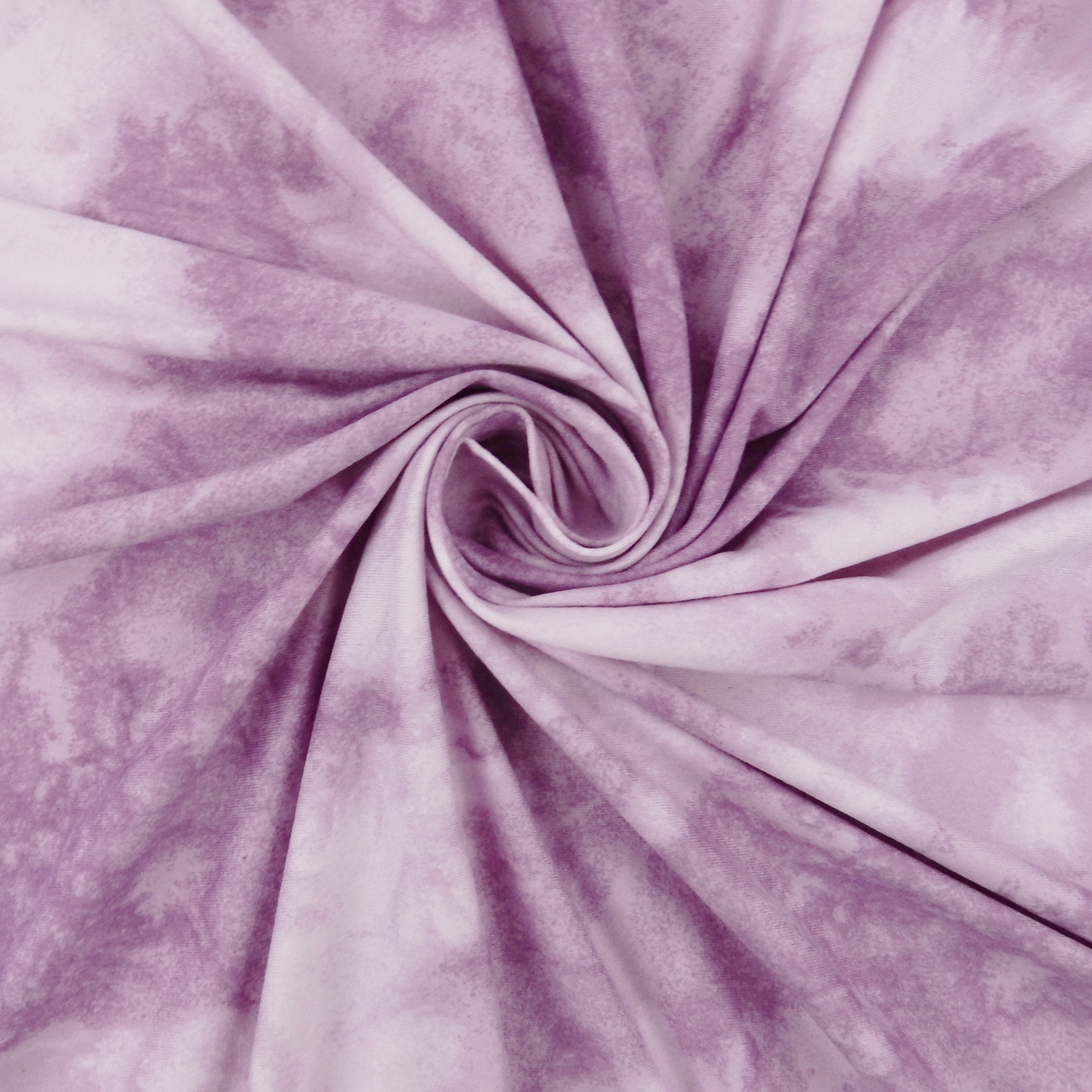 A tie dye print in shades of lilac on a 4-way Stretch Polyester-Rayon-Spandex Jersey Fabric. Approximately 35% stretch across the width and 25% stretch down the length