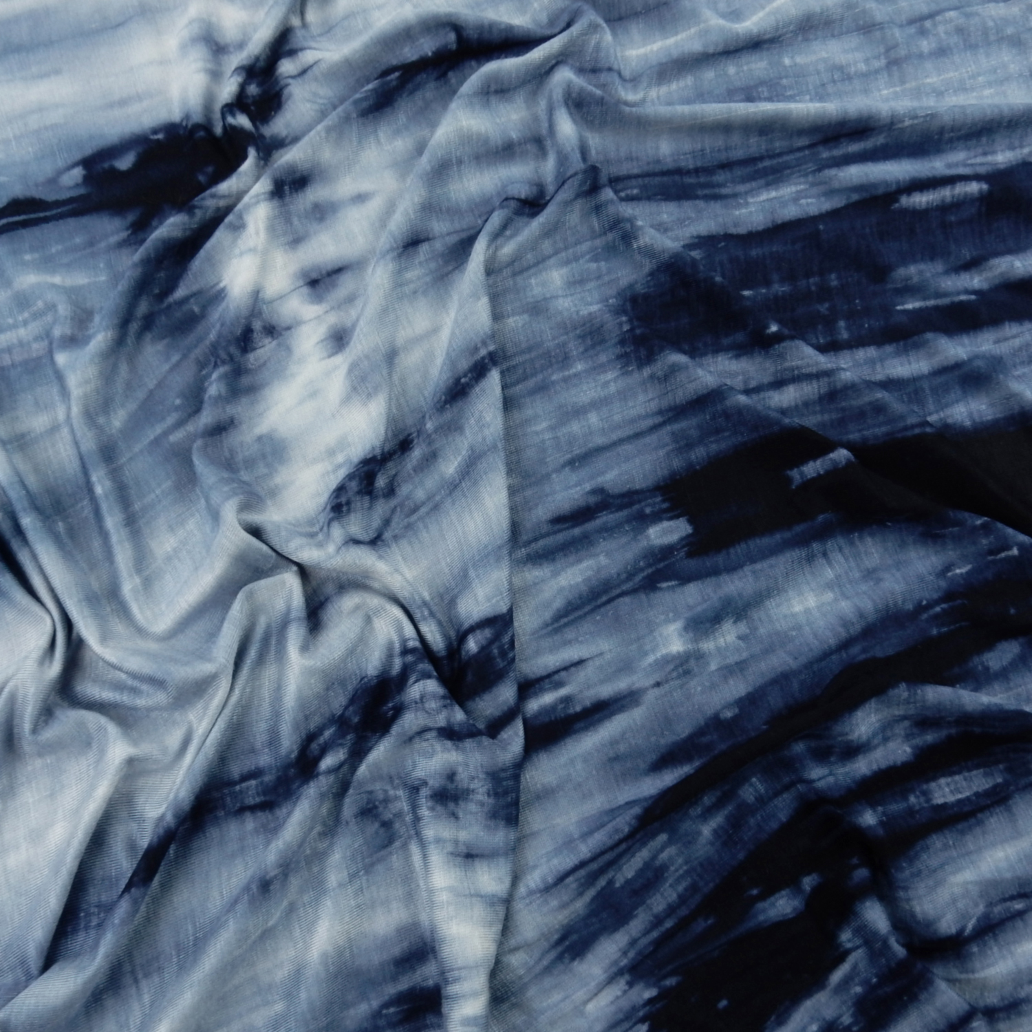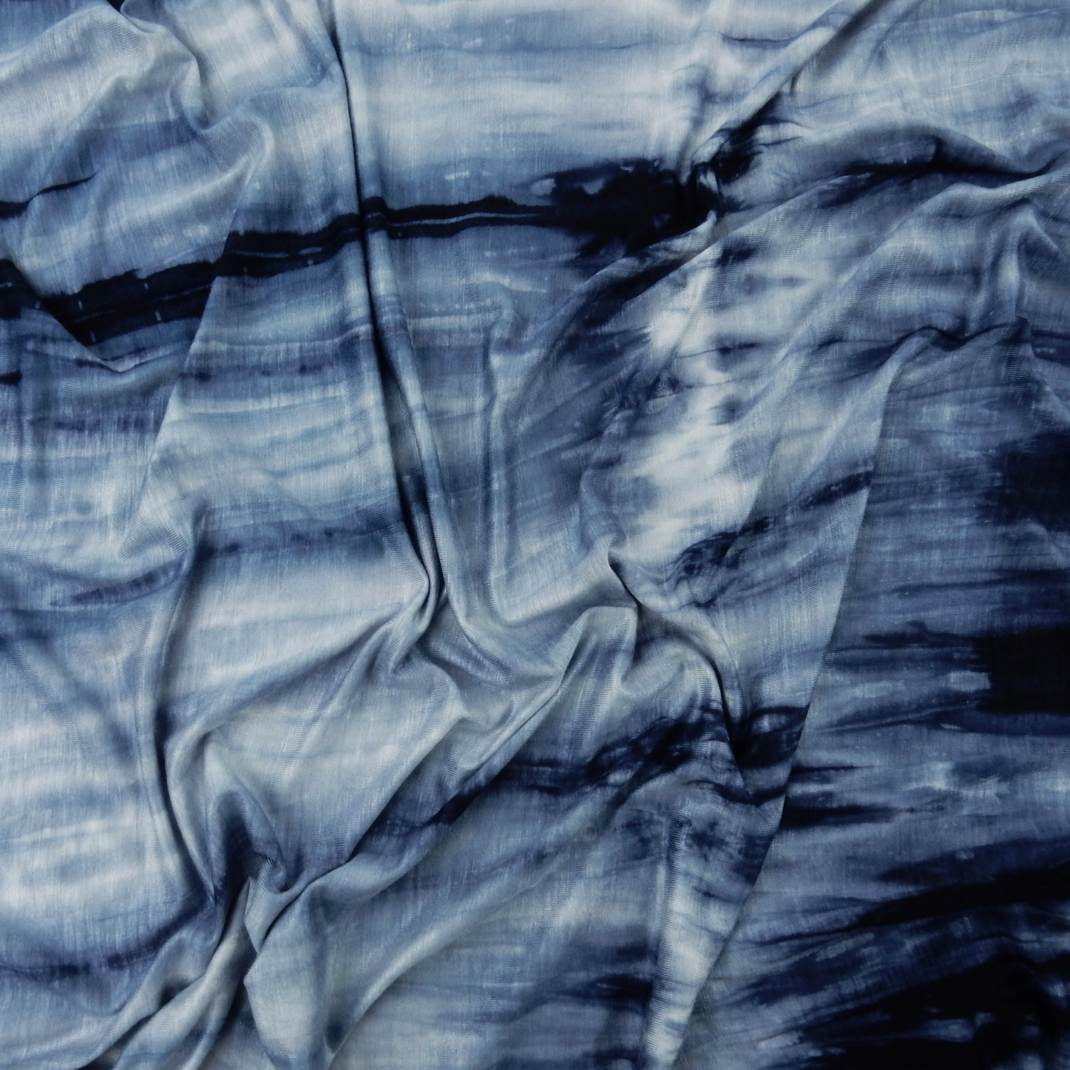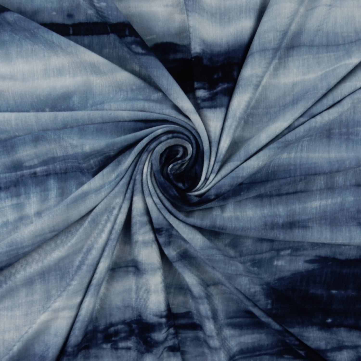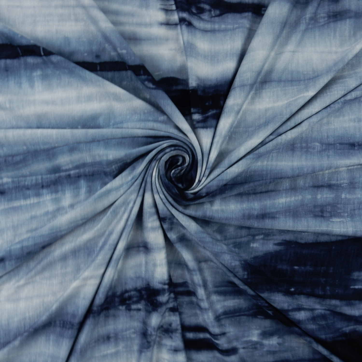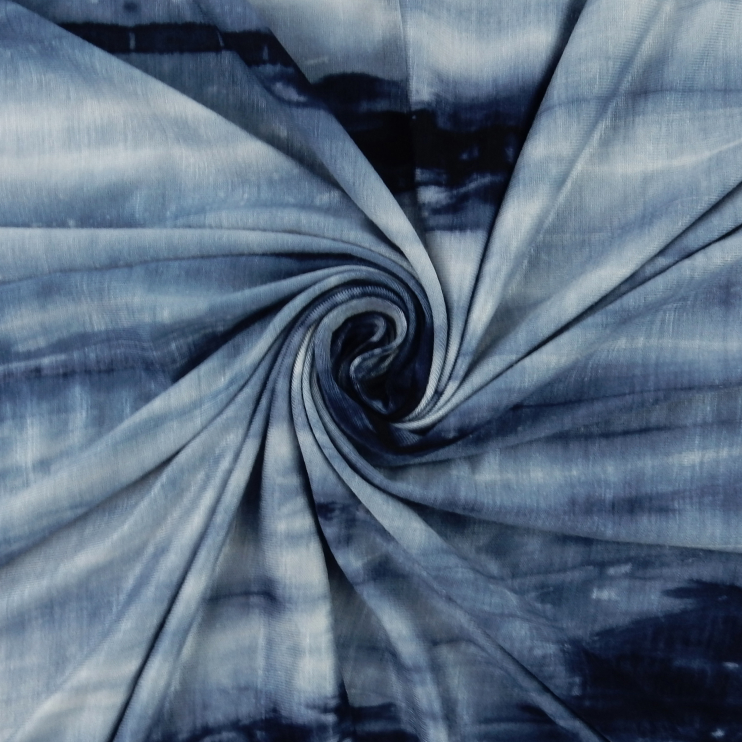A tie dye print in shades of blue on a 4-way Stretch Polyester-Rayon-Spandex Jersey Fabric. Approximately 35% stretch across the width and 25% stretch down the length