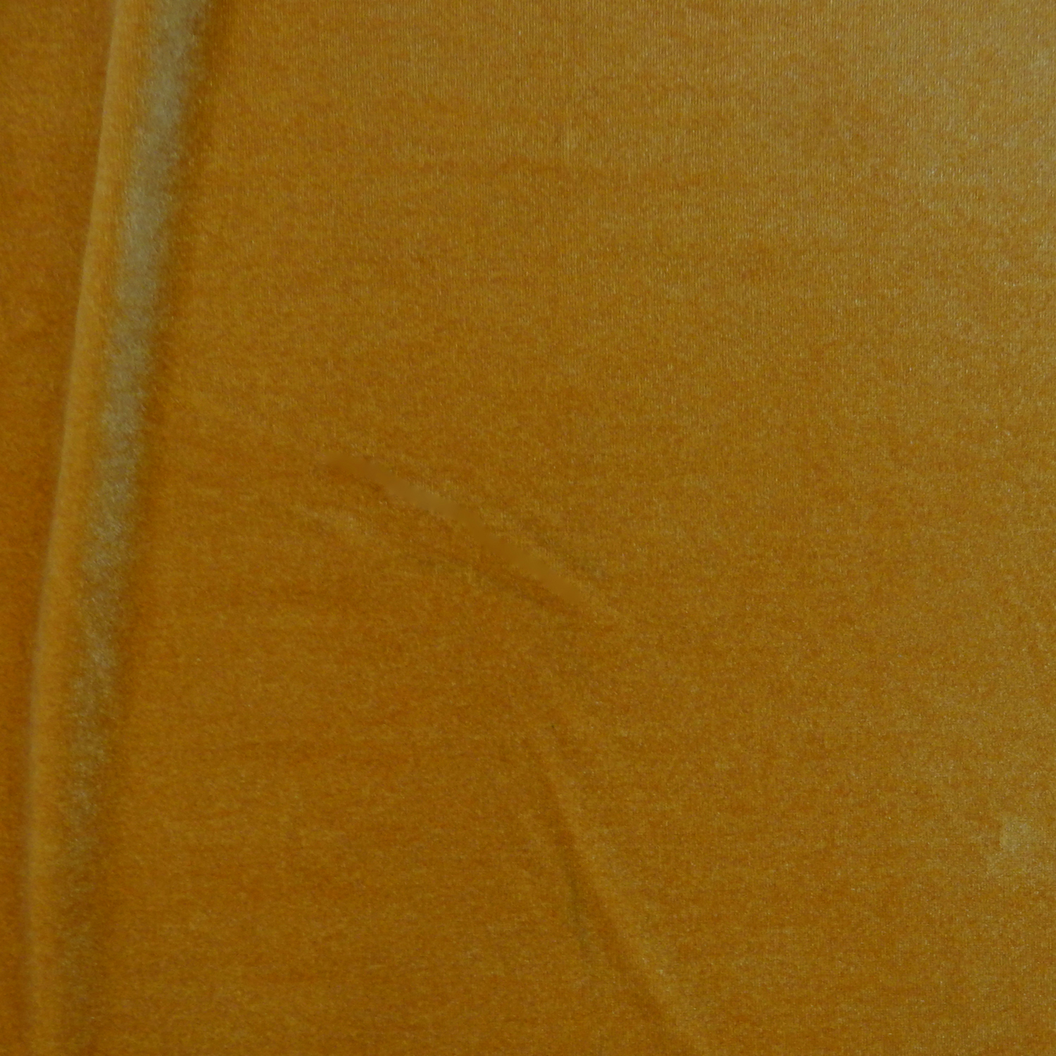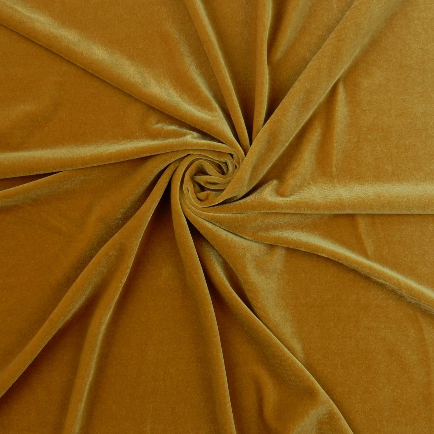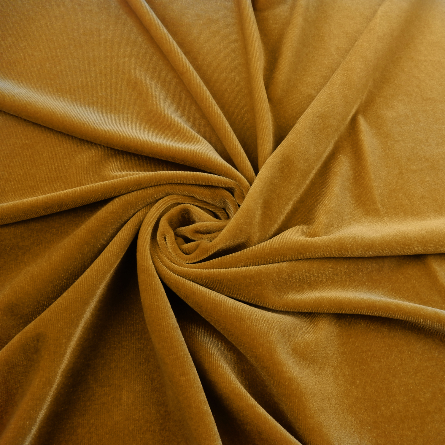 A solid 24k gold color 350 GSM, 4-way Stretch Spandex Velvet Fabric with a soft, full drape, plush hand and an approximate 20% stretch, made in Korea.