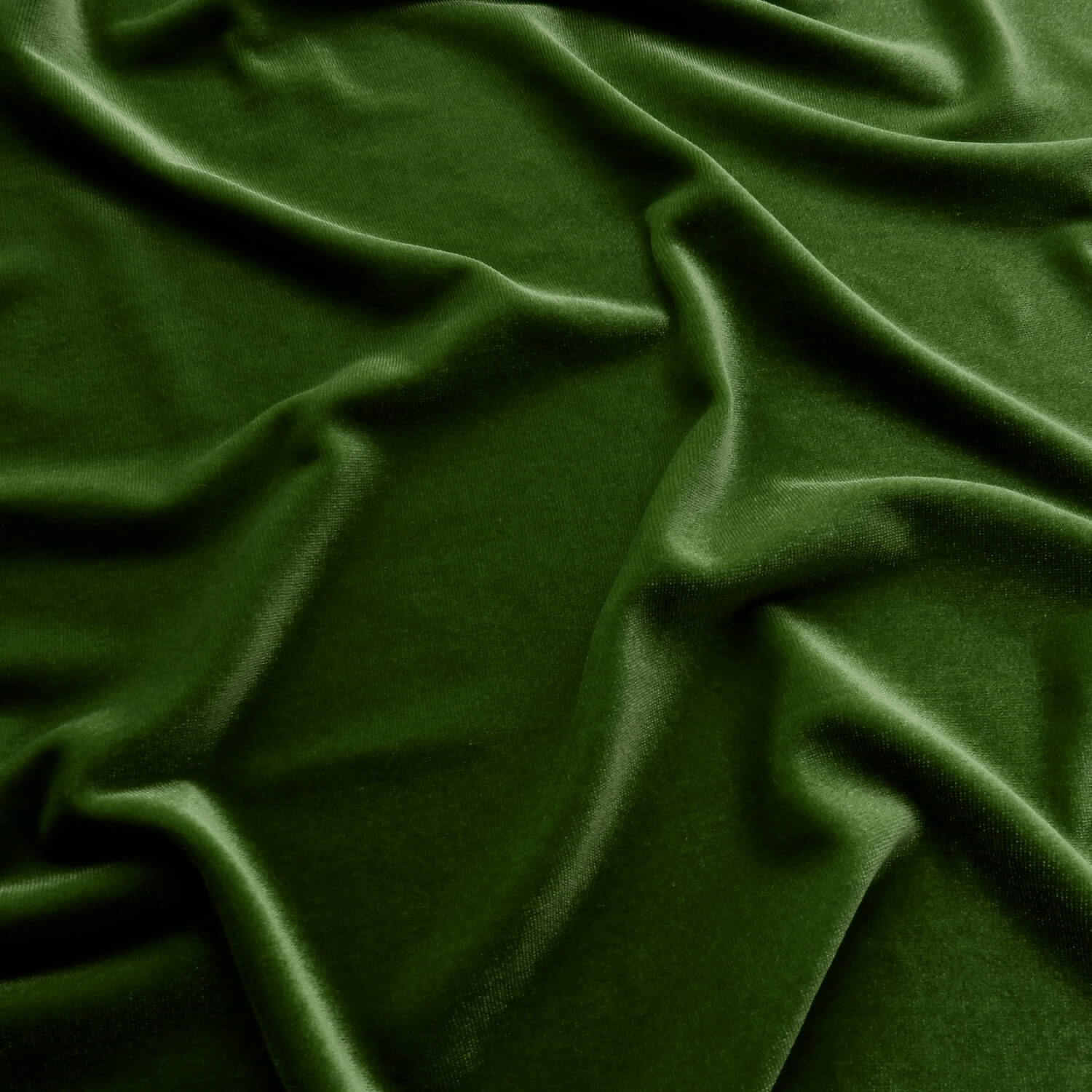 A solid Greek olive 350 GSM, 4-way Stretch Spandex Velvet Fabric with a soft, full drape, plush hand and an approximate 20% stretch, made in Korea.