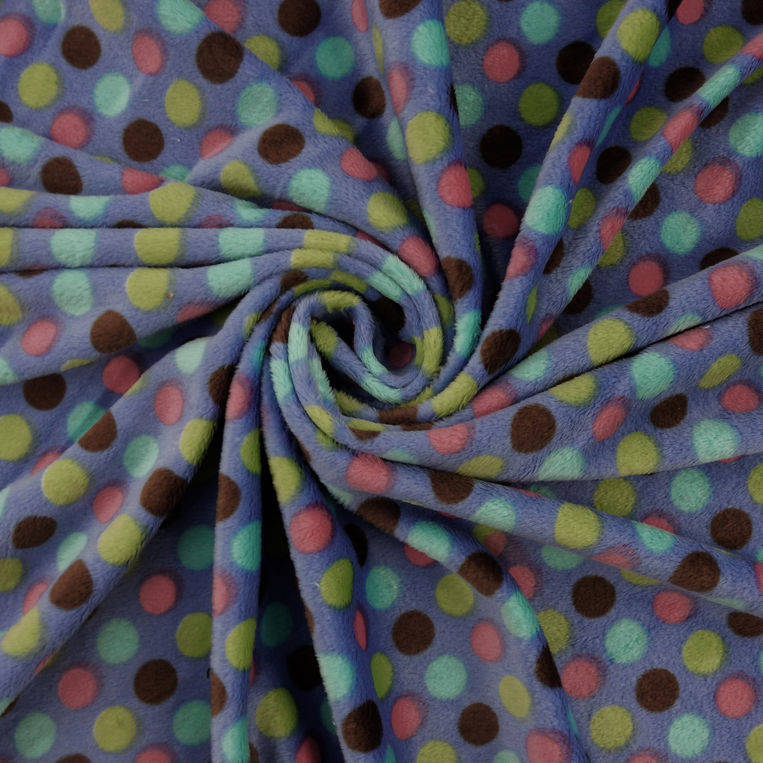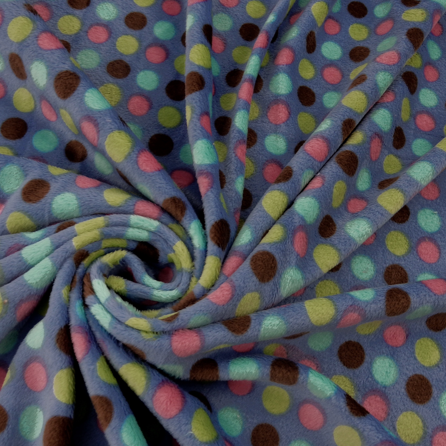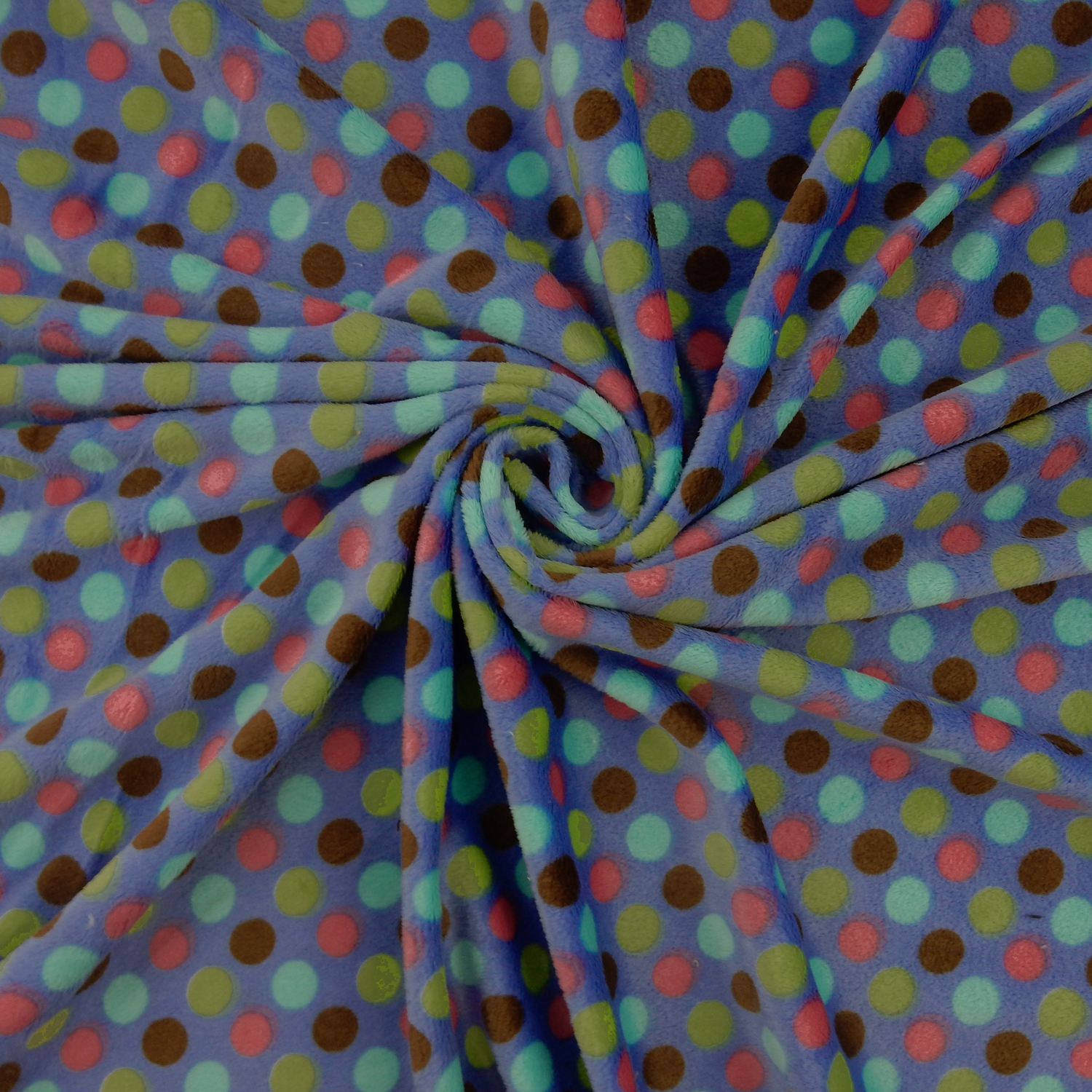 Approximate 5/8″ dots in brown, coral, lime green and turquoise on a periwinkle blue background soft, Melt In Your Hand Minky Fabric with two-way stretch across the width.