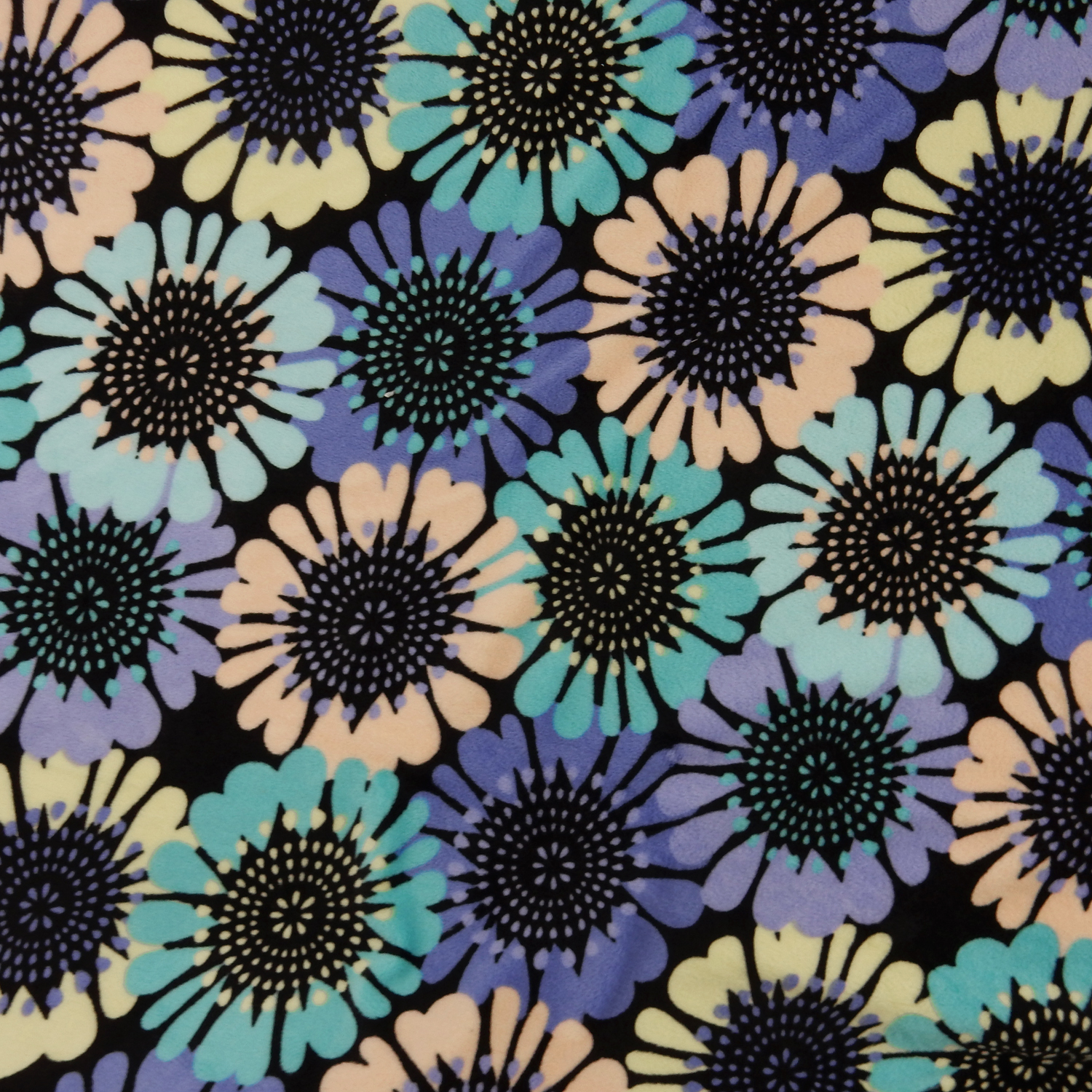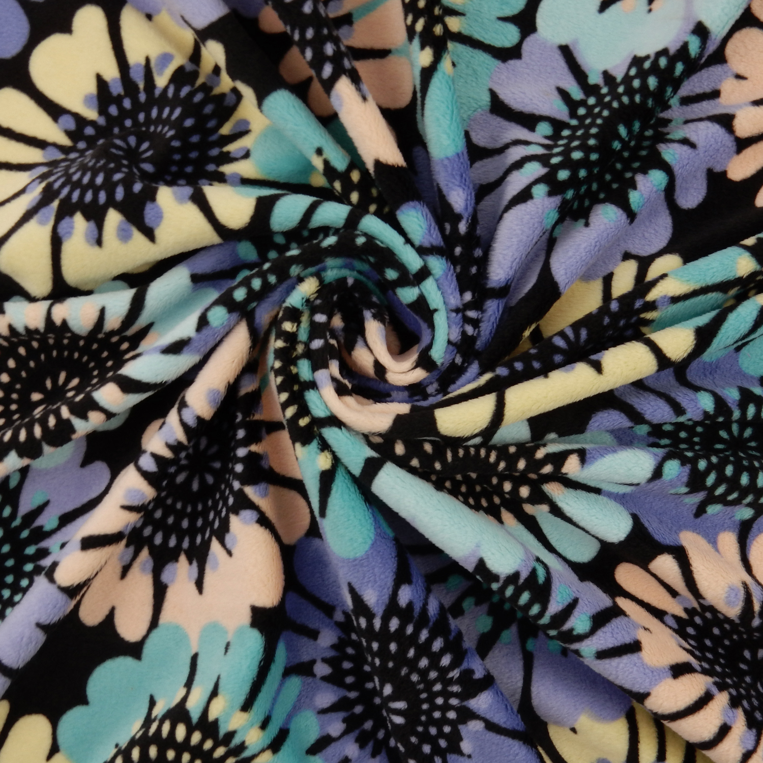 A modern flower print in yellow, peach, aqua, lilac and turquoise over a black background soft Melt In Your Hand Minky Fabric with two-way stretch across the width.