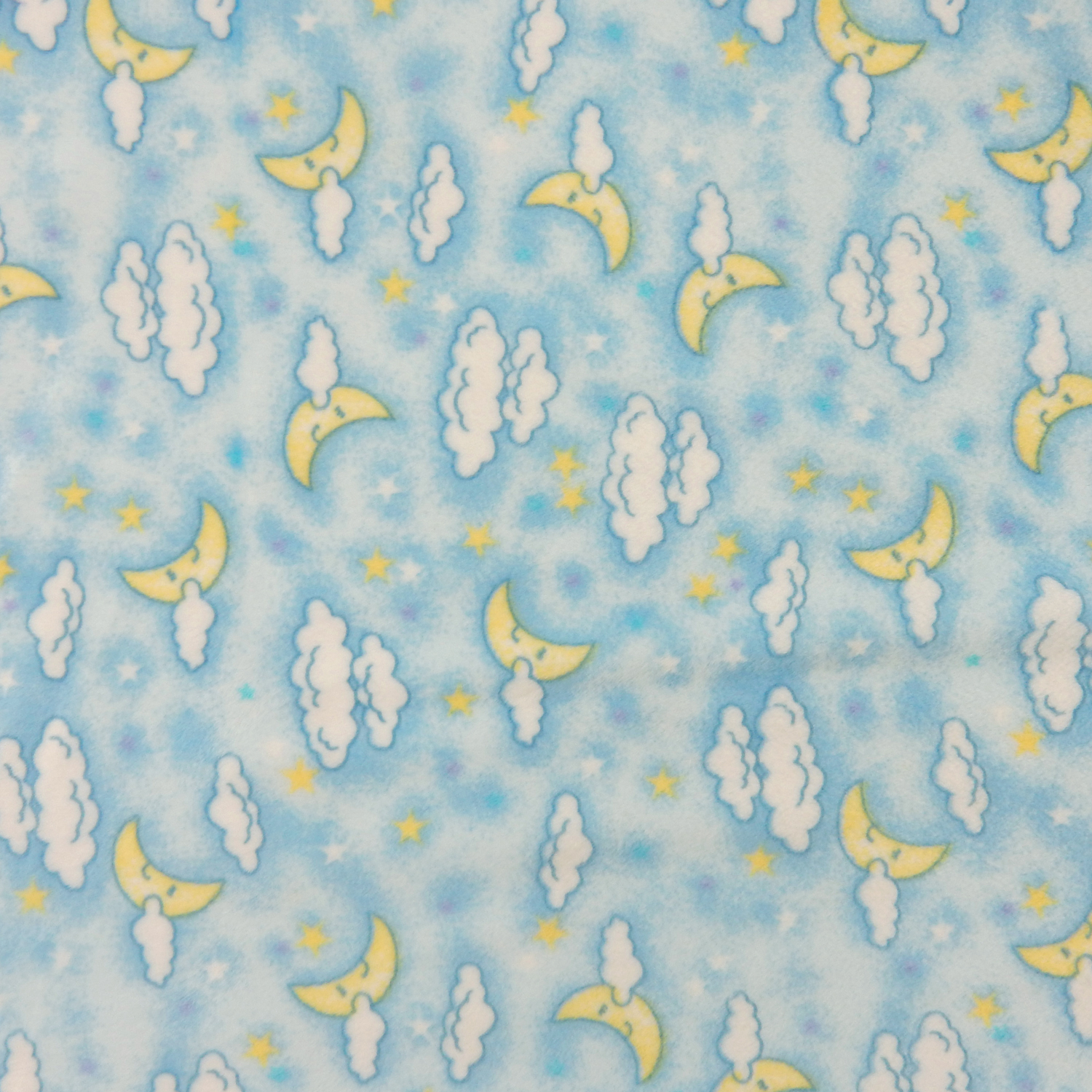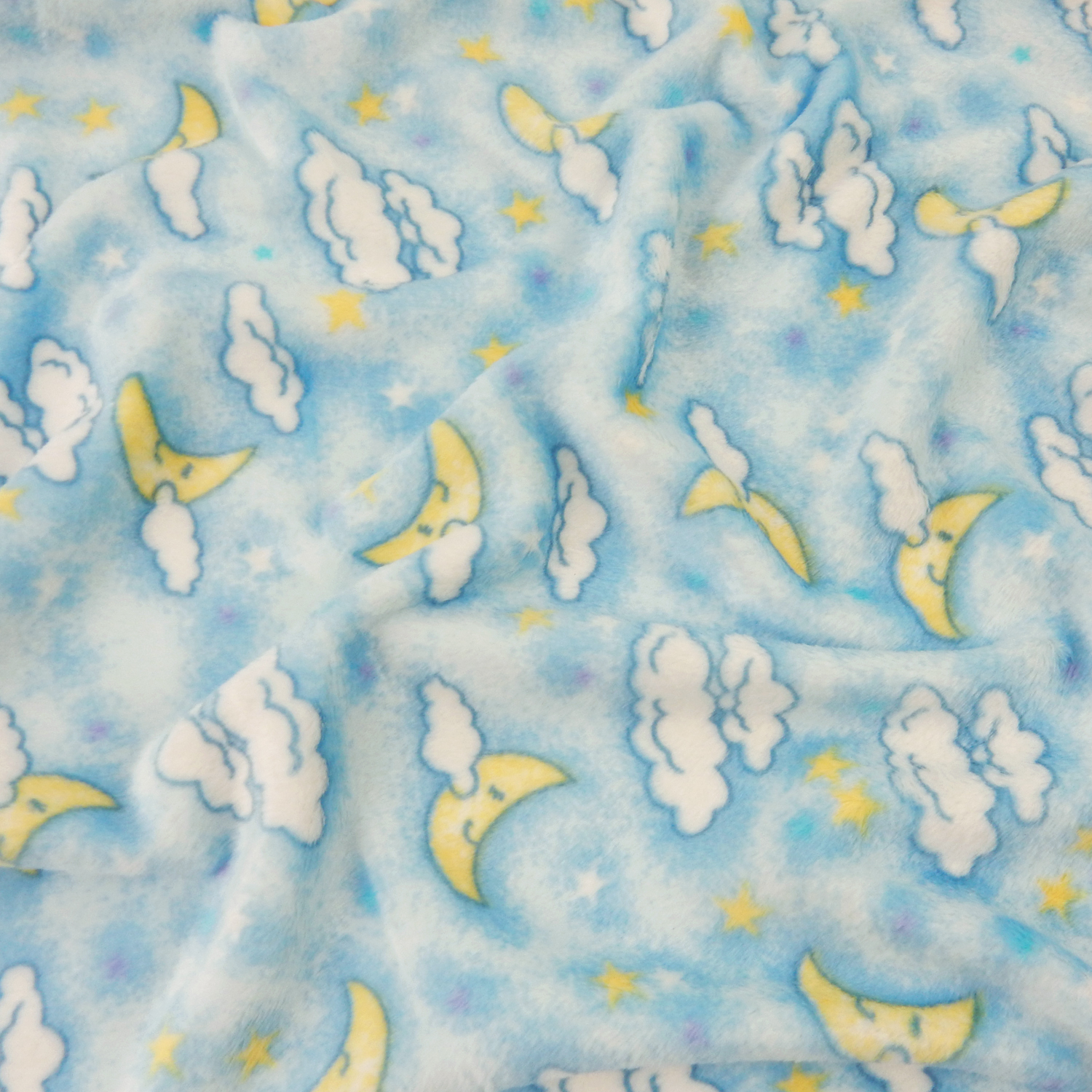 White clouds and crescent moons over a blue background with matching color stars on a soft Melt In Your Hand Minky Fabric with two-way stretch across the width.