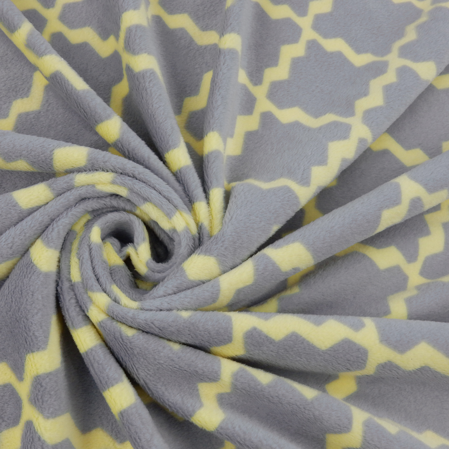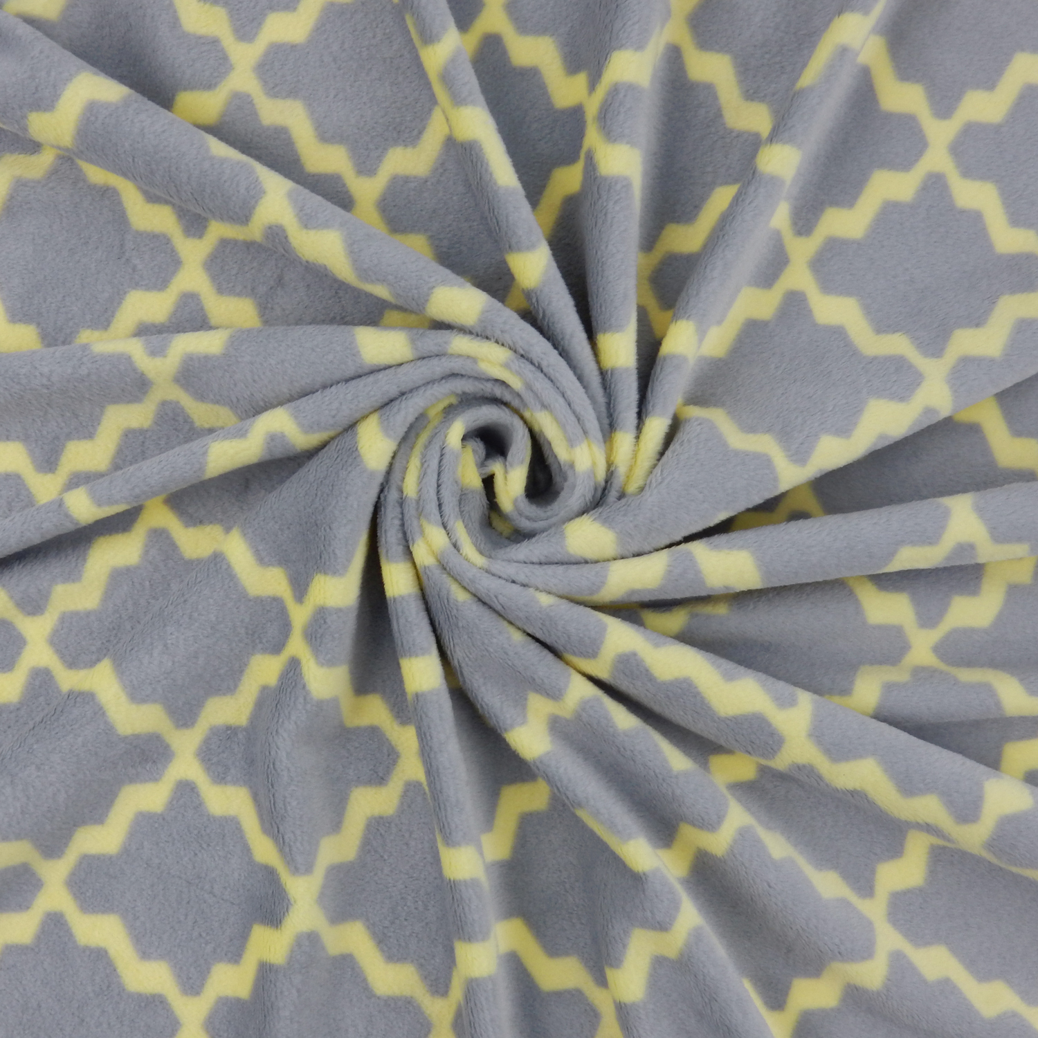 A geometric tile print in gray and soft yellow colors on a soft Melt In Your Hand Minky Fabric with two-way stretch across the width.