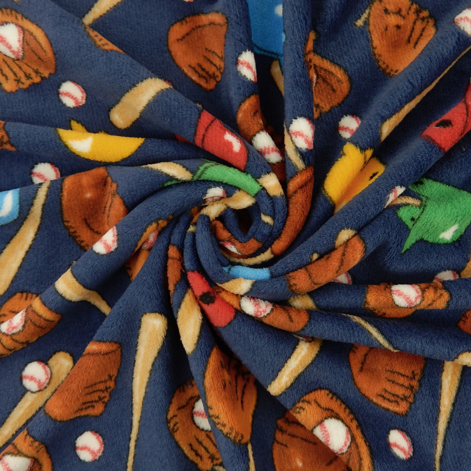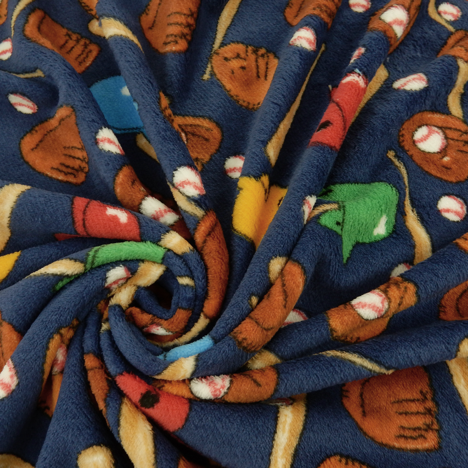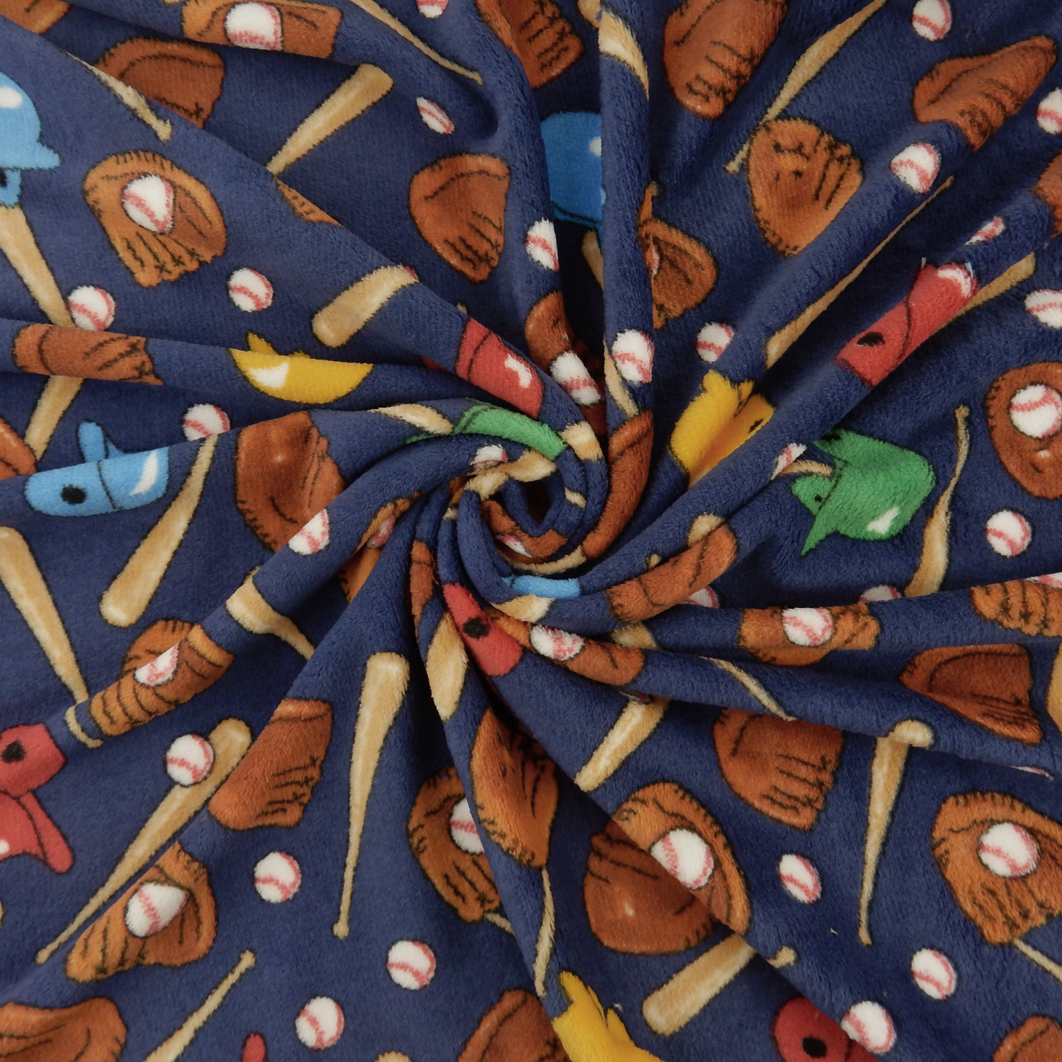 A Baseball Print with balls, bats, helmets and gloves over a navy blue background amazingly soft, 3/8 inch thick, Whisper Fleece Fabric with the Texture of Minky on one side and Minky Fur on the other, with melt In Your Hand Softness. The printed design is slight less vibrant on the fur side of the fabric.