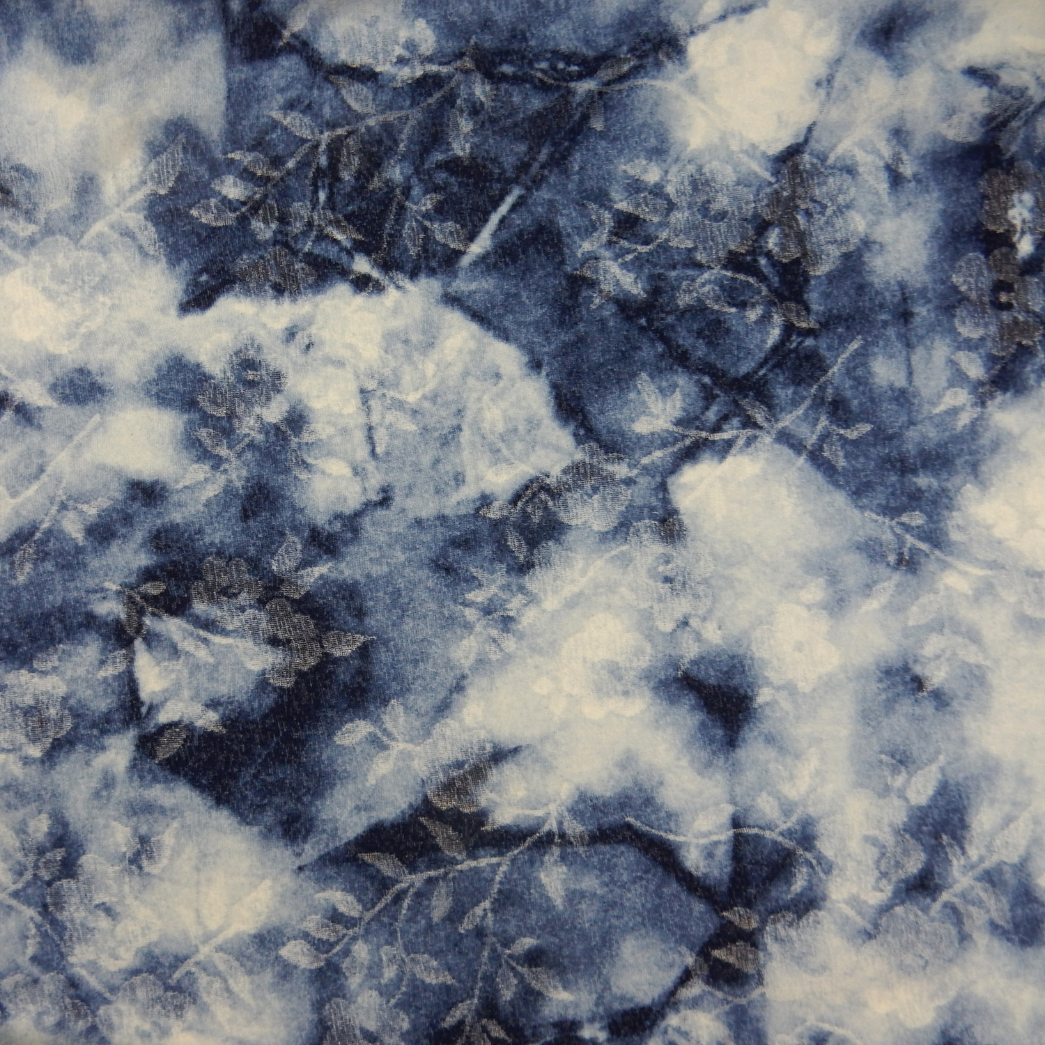 A very light weight, semi-sheer Burnout Floral Print Fabric in shades of blue and white with 4-way stretch.