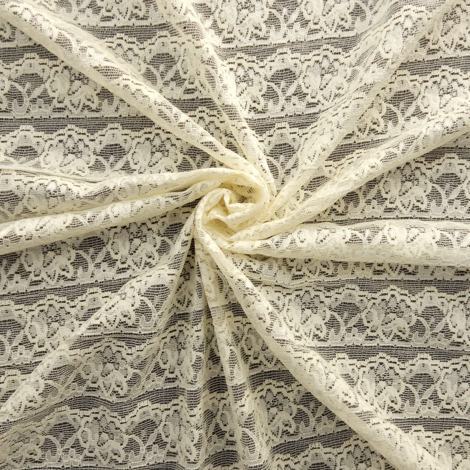 An open weave, gracefully detailed, semi-sheer, ivory color Stretch Crochet Knit Lace Fabric. Crochet Lace is a knit fabric with finer stitches allowing for a more delicate, refined, and detailed pattern