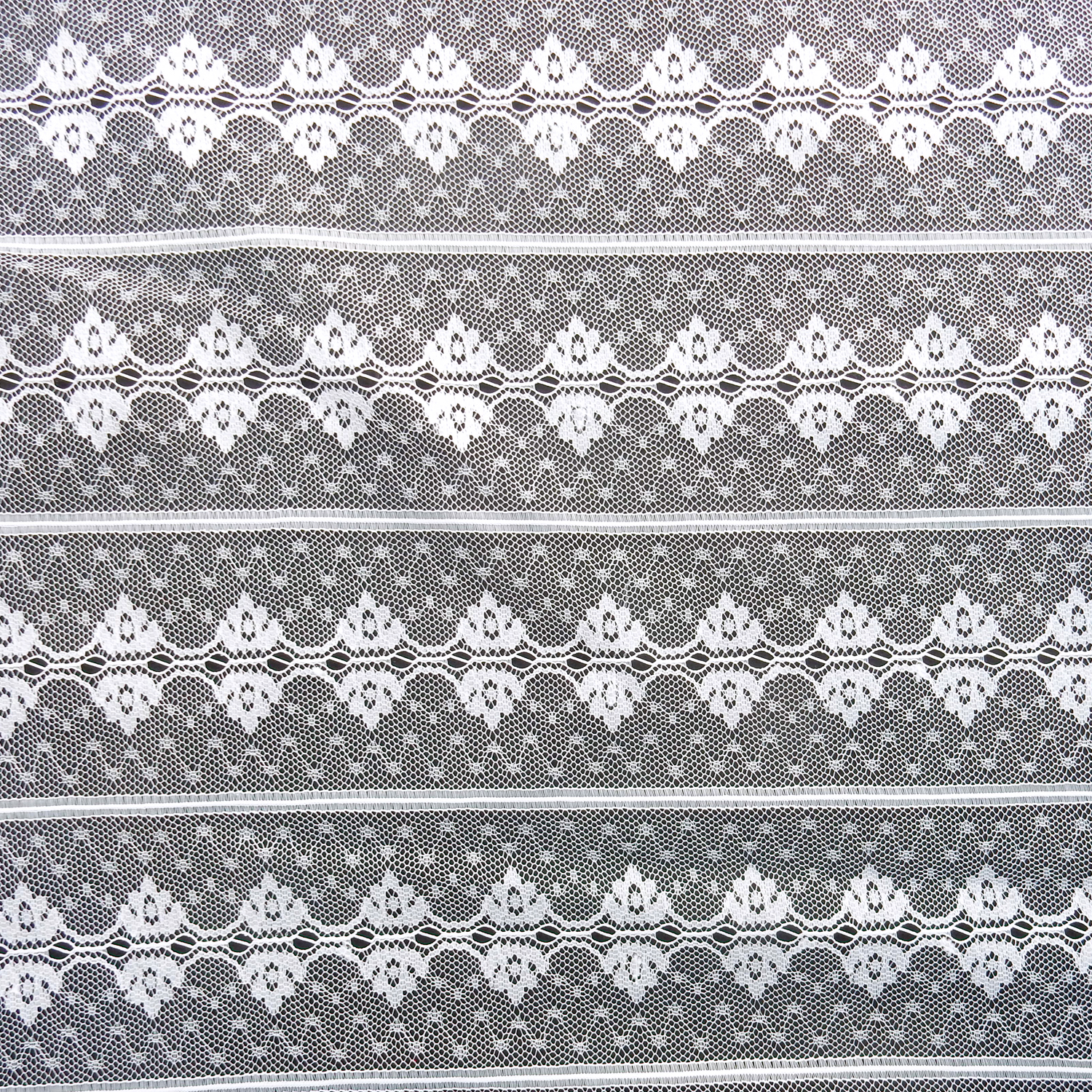 A light weight open weave, gracefully detailed, White Sheer Lace Fabric. This is not a railroad design, the stripes run from the length of the fabric.