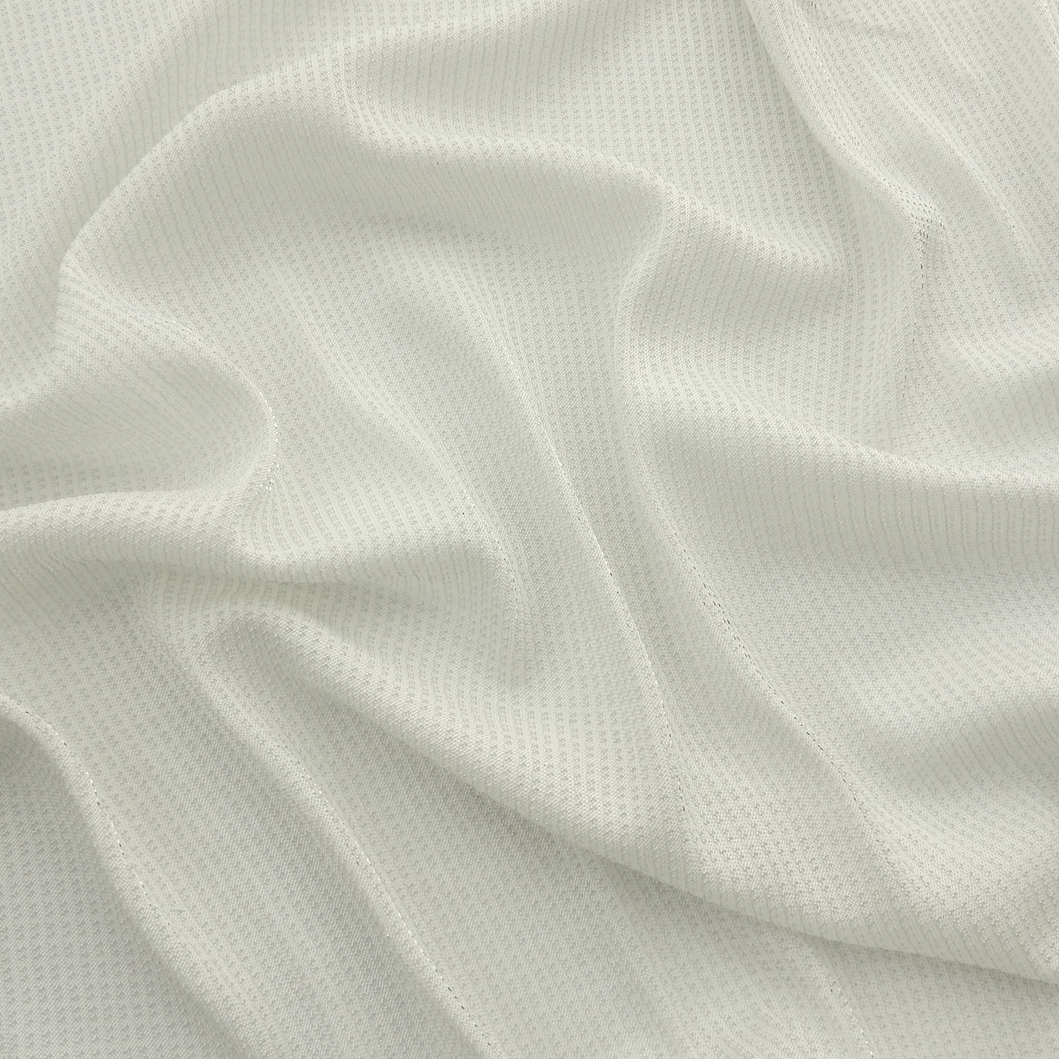 A dress weight semi-sheer eggshell color, Stretch Jacquard Fabric woven with fine silver mylar which shimmers as light moves across the flowing fabric. Approximately 18% stretch across the width..
