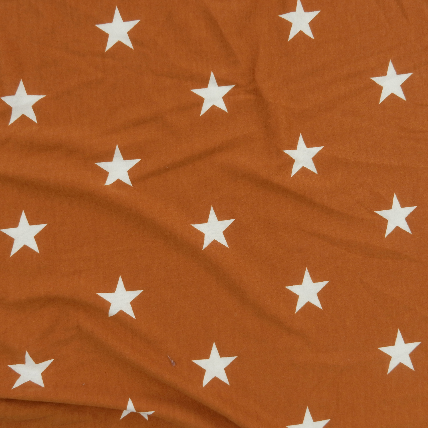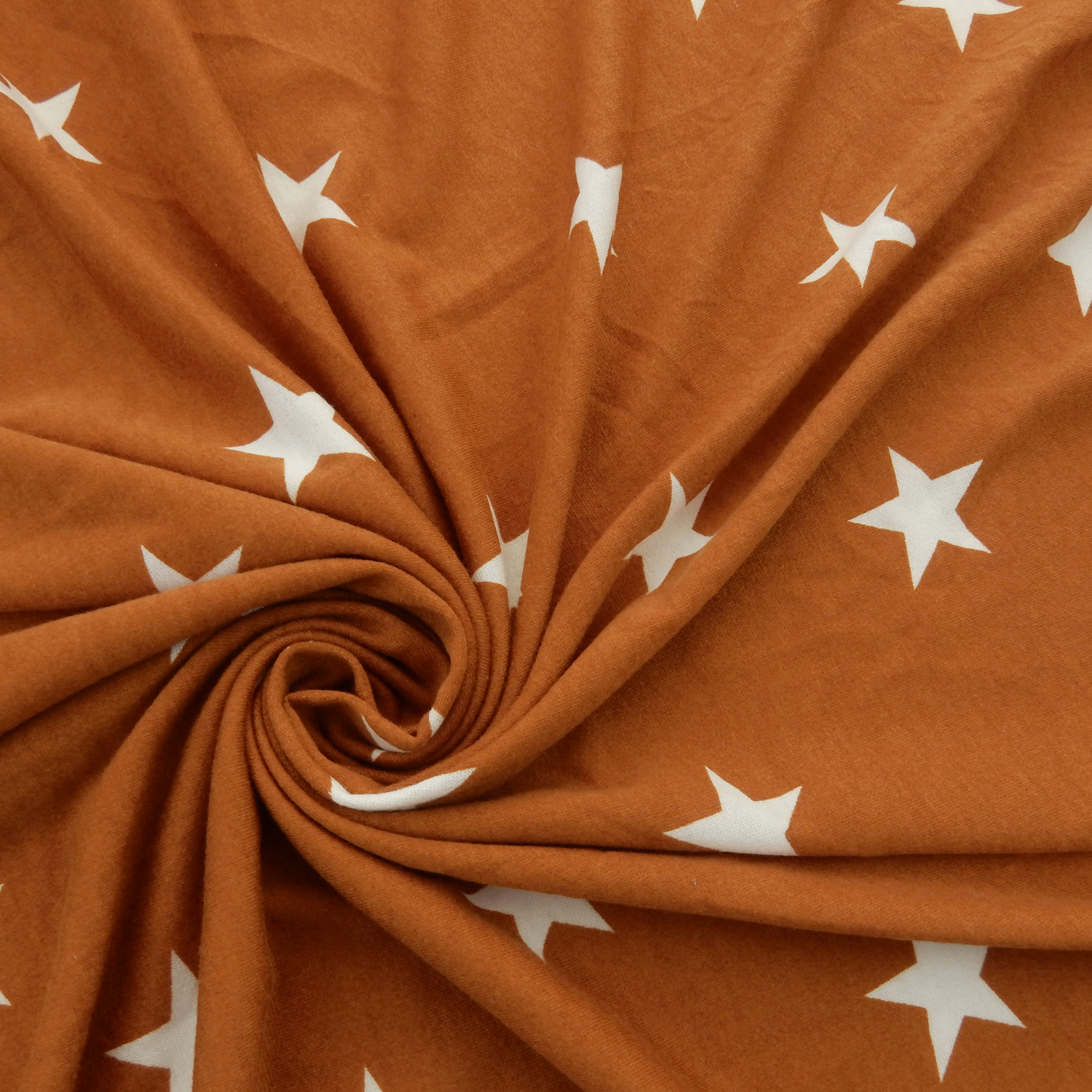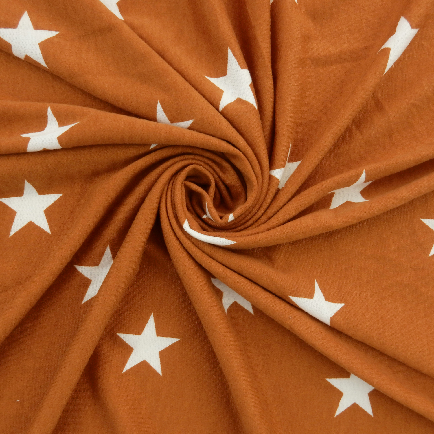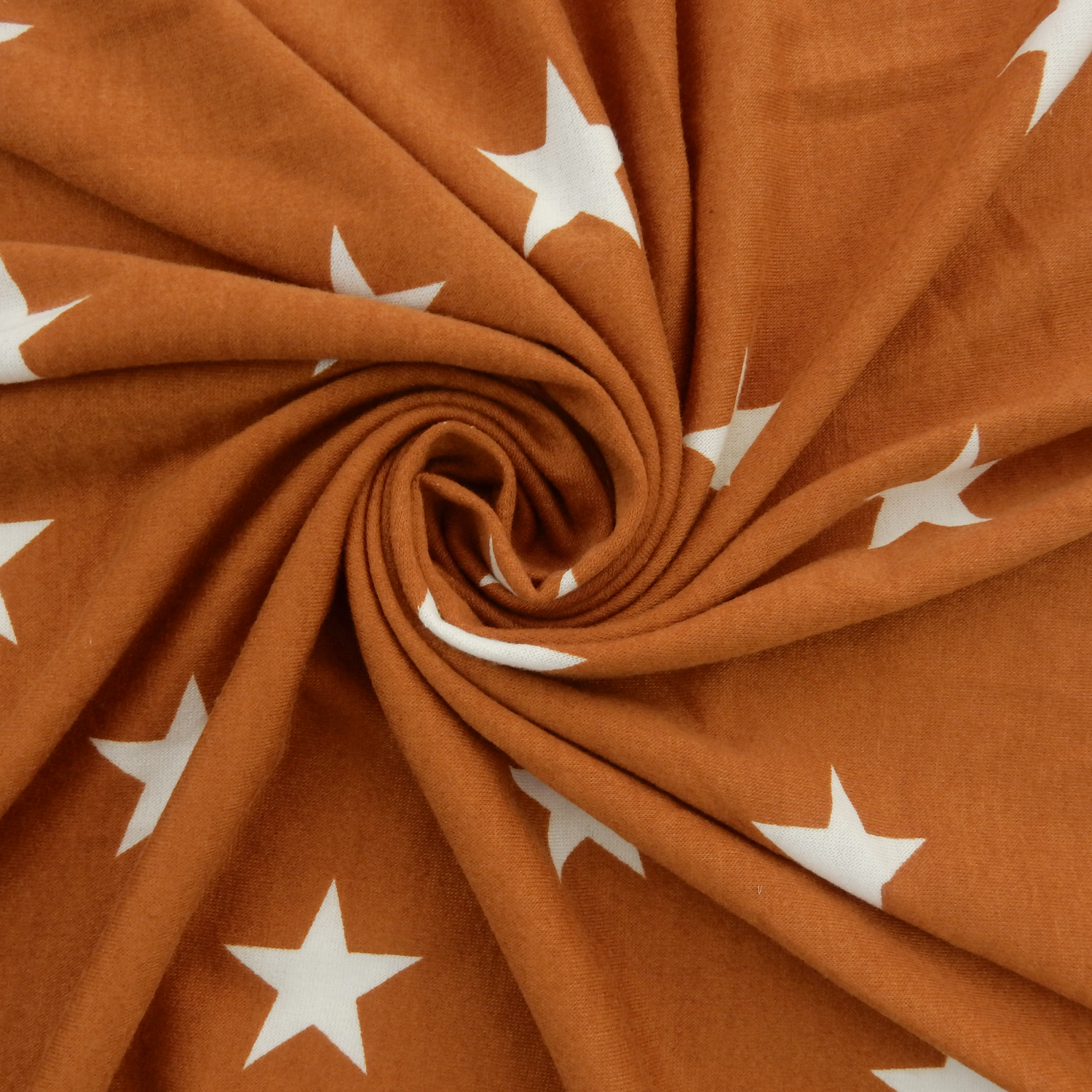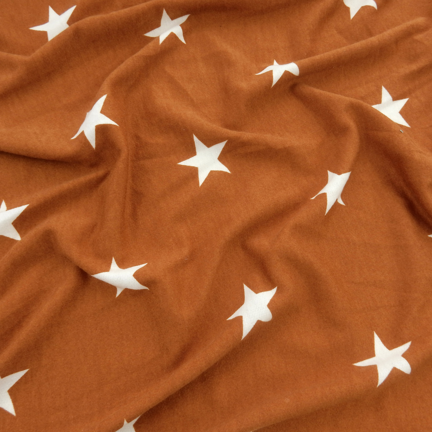 White 1.5″ printed stars on a wonderfully soft Stretch French Terry Knit Fabric in a muted spice color with approximately 40% 2-way stretch across the width of the fabric.