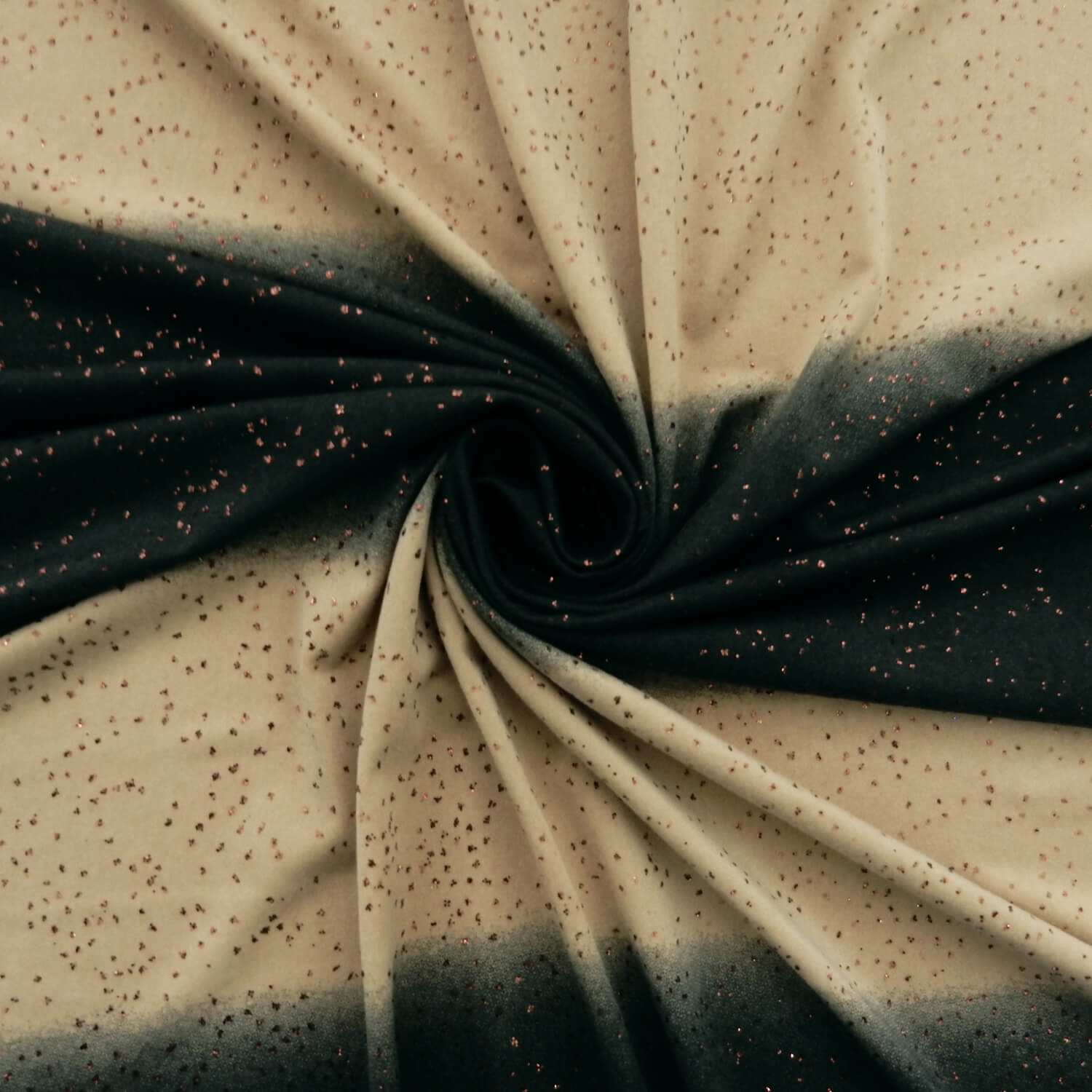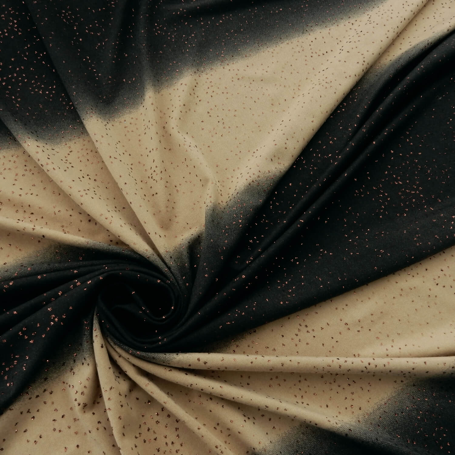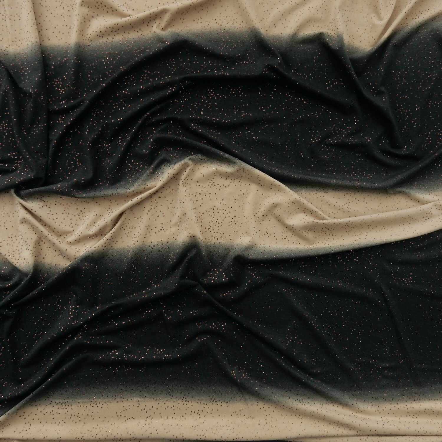 Approximately 2 3/4″ stripes of beige and 8 inches of shades of smokey gray with copper color lurex on a Stretch Spandex Fabric This is not a railroad design, the stripes run the length of the fabric. Made in Korea